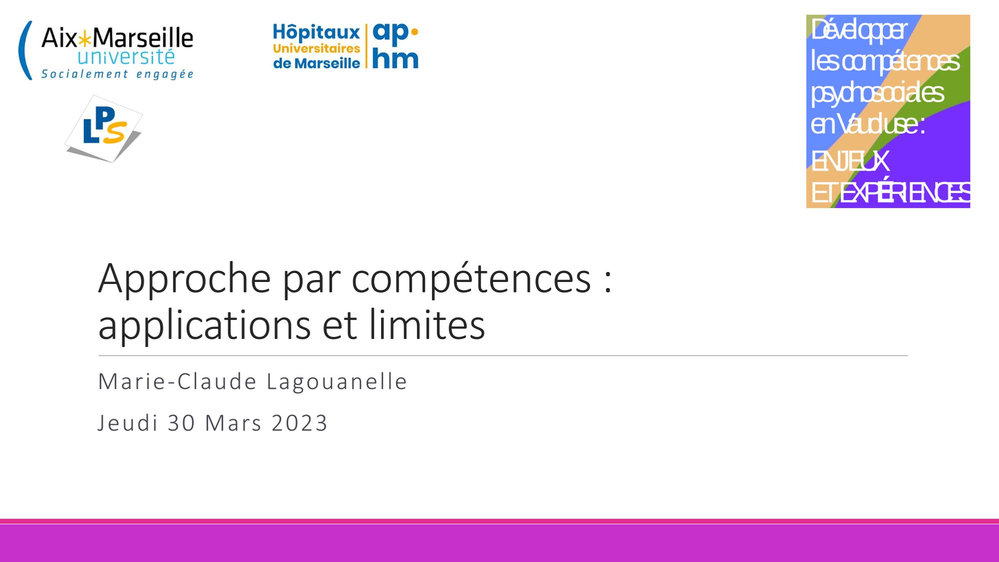 - Marie-Claude LAGOUANELLE-SIMEONI, Médecin de santé publique, Université Aix-Marseille, Assistance Publique des Hôpitaux de Marseille - Approche par compétences : applications et limites.