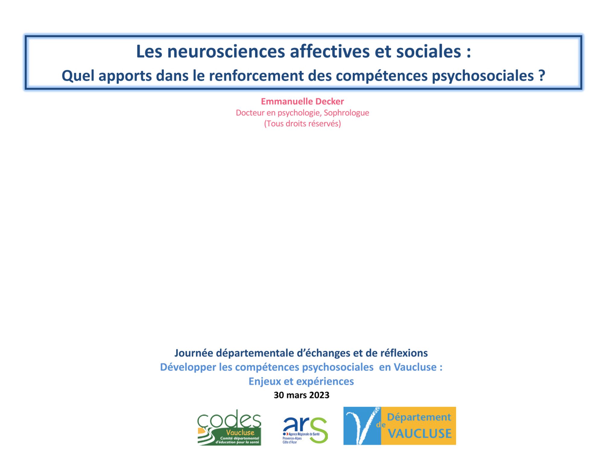 - Emmanuelle DECKER, Docteure en psychologie, Sophrologue - Les neurosciences affectives et sociales : quels apports dans le renforcement des compétences psychosociales ?