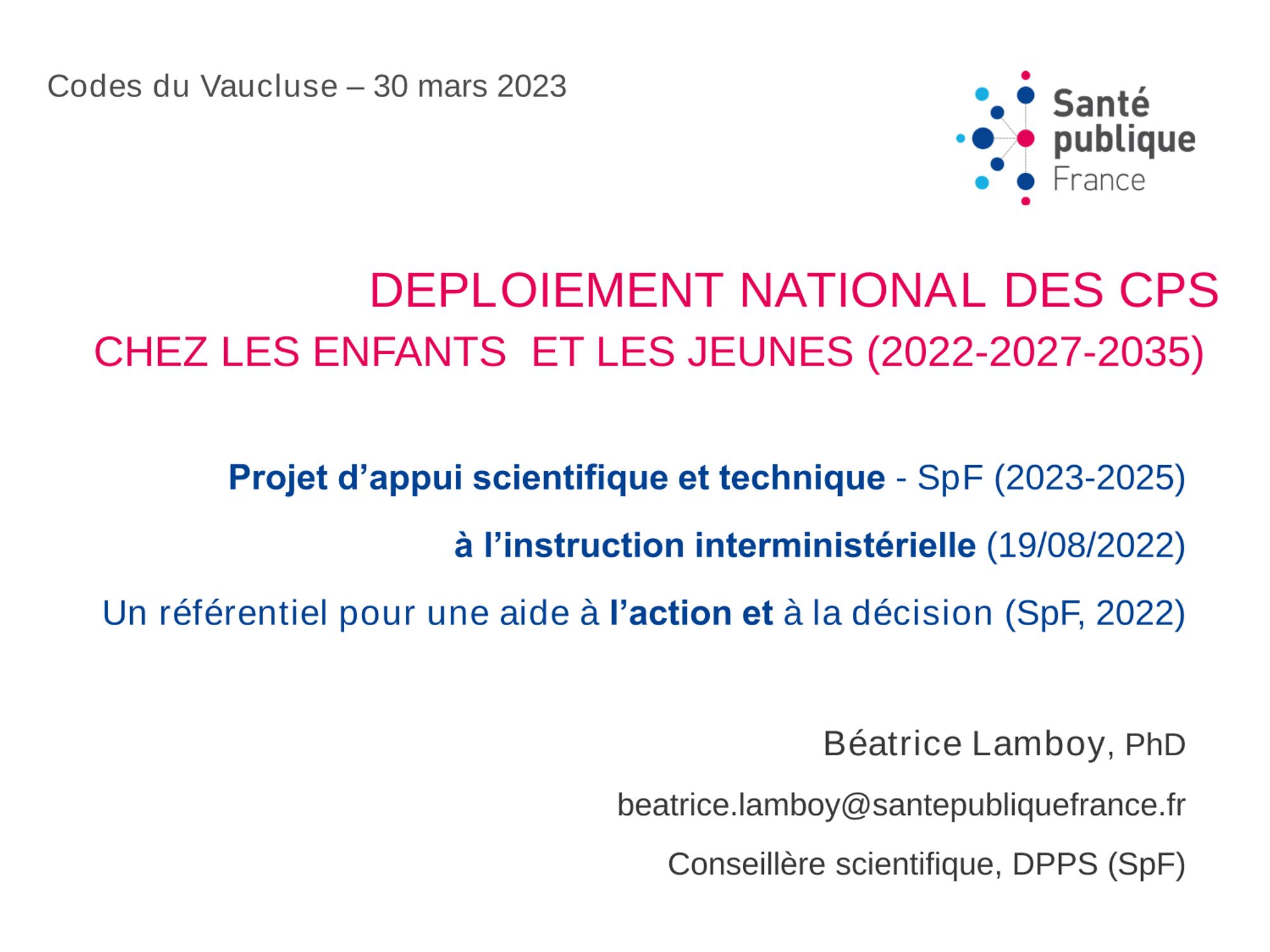 15h45 - 16h45 : Béatrice LAMBOY, Santé Publique France - Présentation du projet national de Santé Publique France.