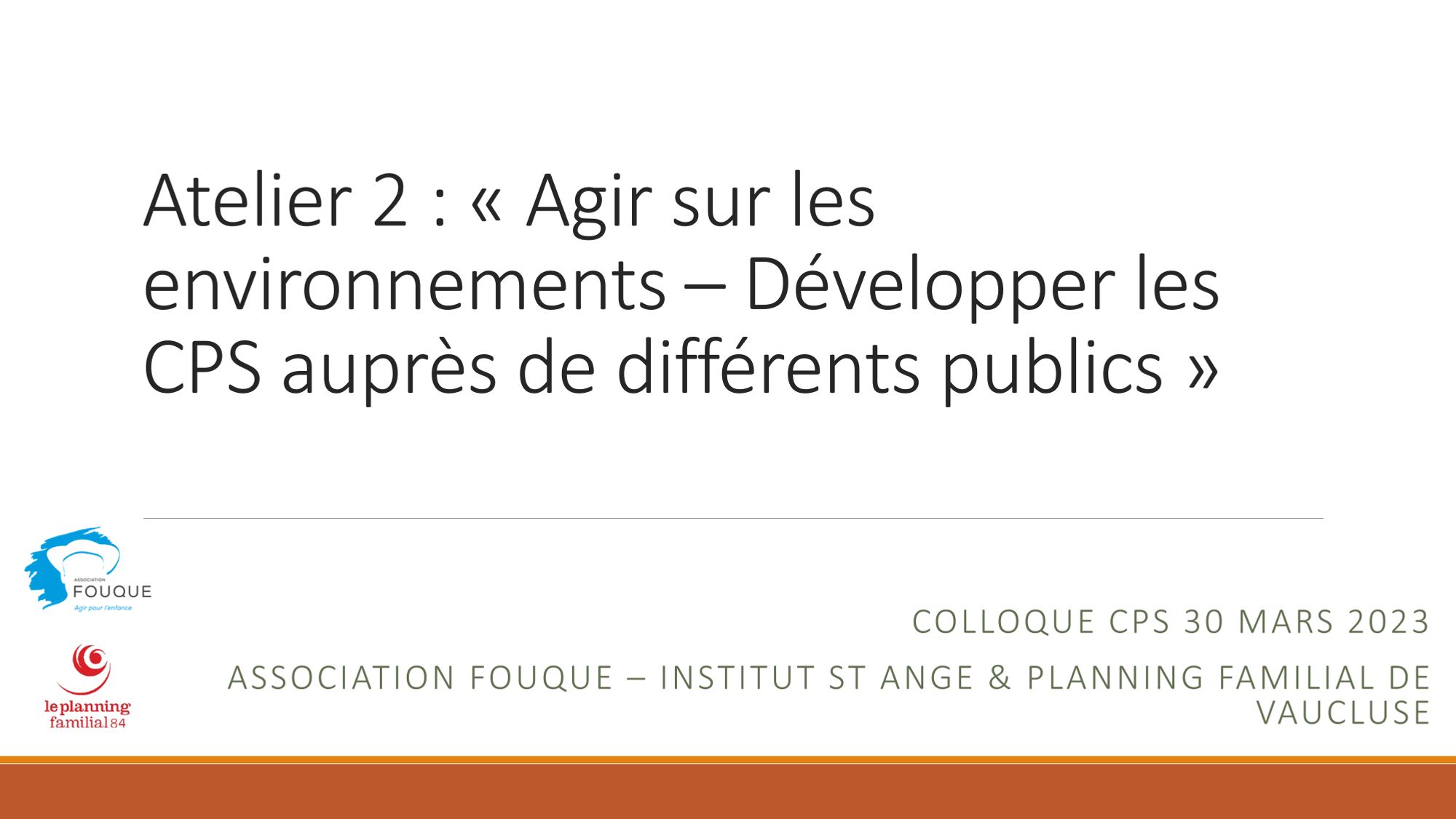 - Agir sur les environnements - Développer les compétences psychosociales auprès de différents publics : petite enfance, public en situation de défavorisation sociale, animé par le CoDES 84, l'Association Fouque, la Mission Locale Jeunes Grand Avignon et le Planning familial 84