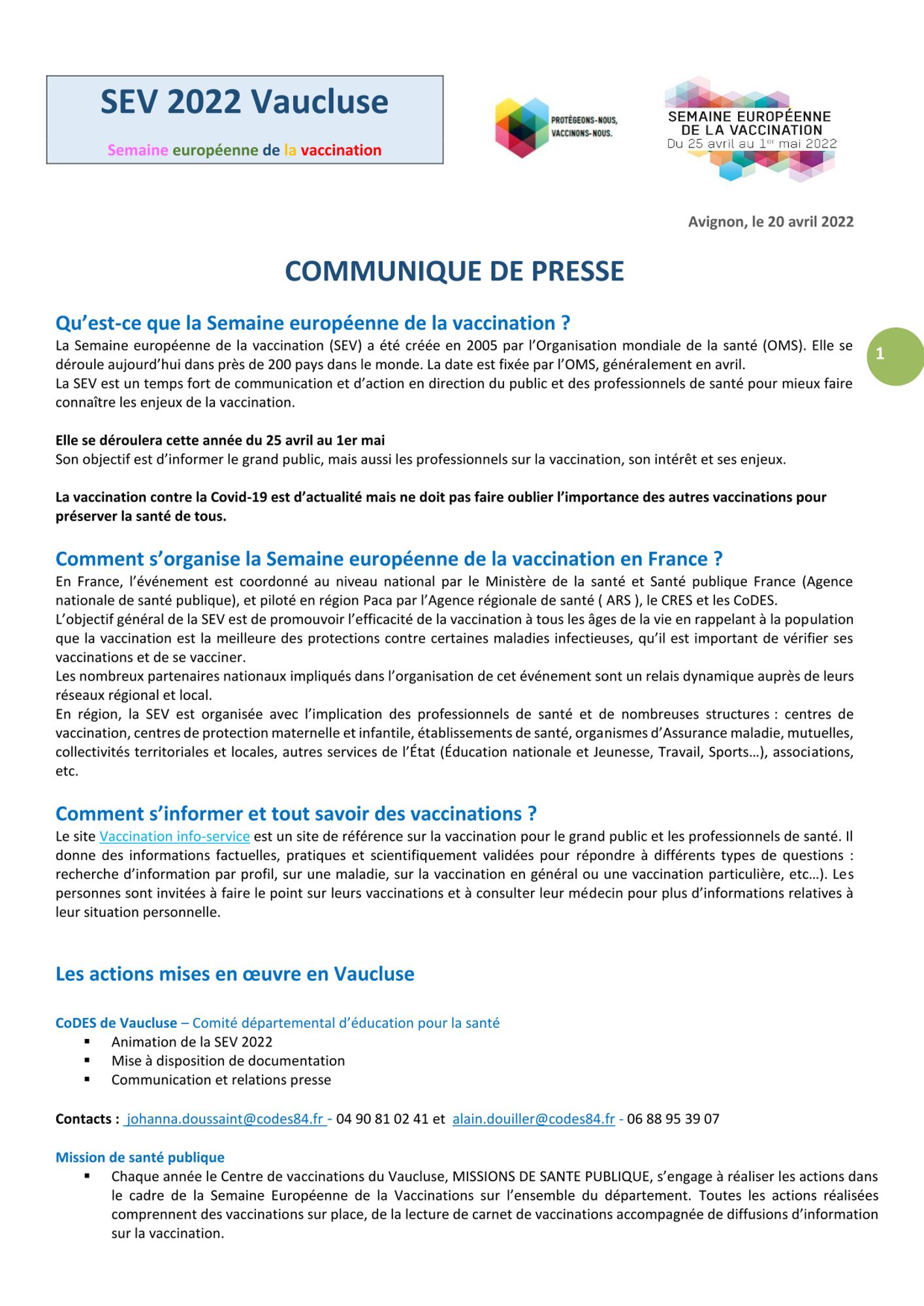- Mercredi 27 avril 2022– 9h– 16h – Stand dans la galerie commerciale d’AUCHAN Le Pontet. Proposition d’information et de vaccination au grand public, quizz sur tablette