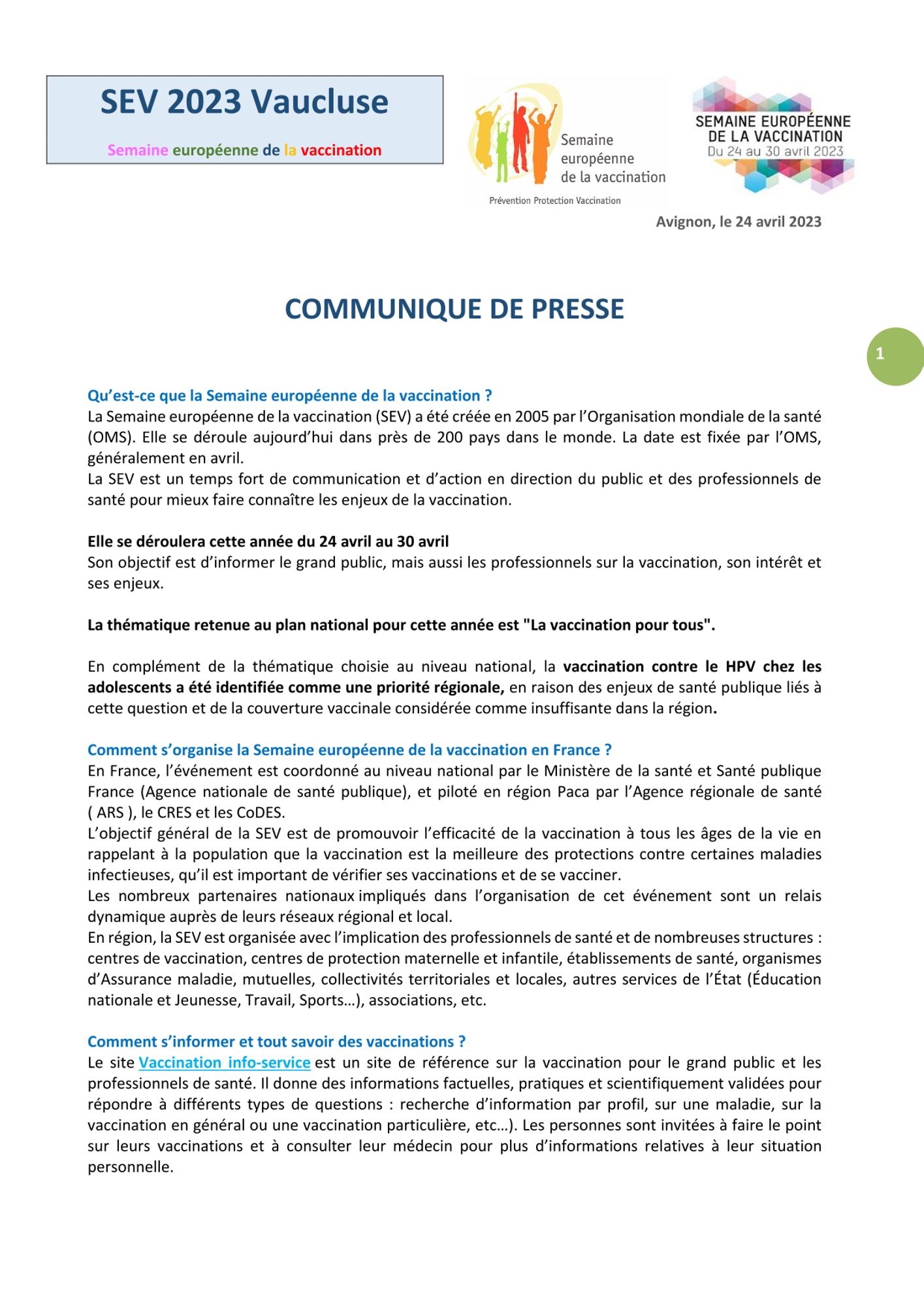 - Coordination de la Semaine européenne de la vaccination en Vaucluse : mobilisation des acteurs ; réunion d'un comité de pilotage ; communication sur les actions mise en œuvre en Vaucluse ; relations presse ; diffusion de documents