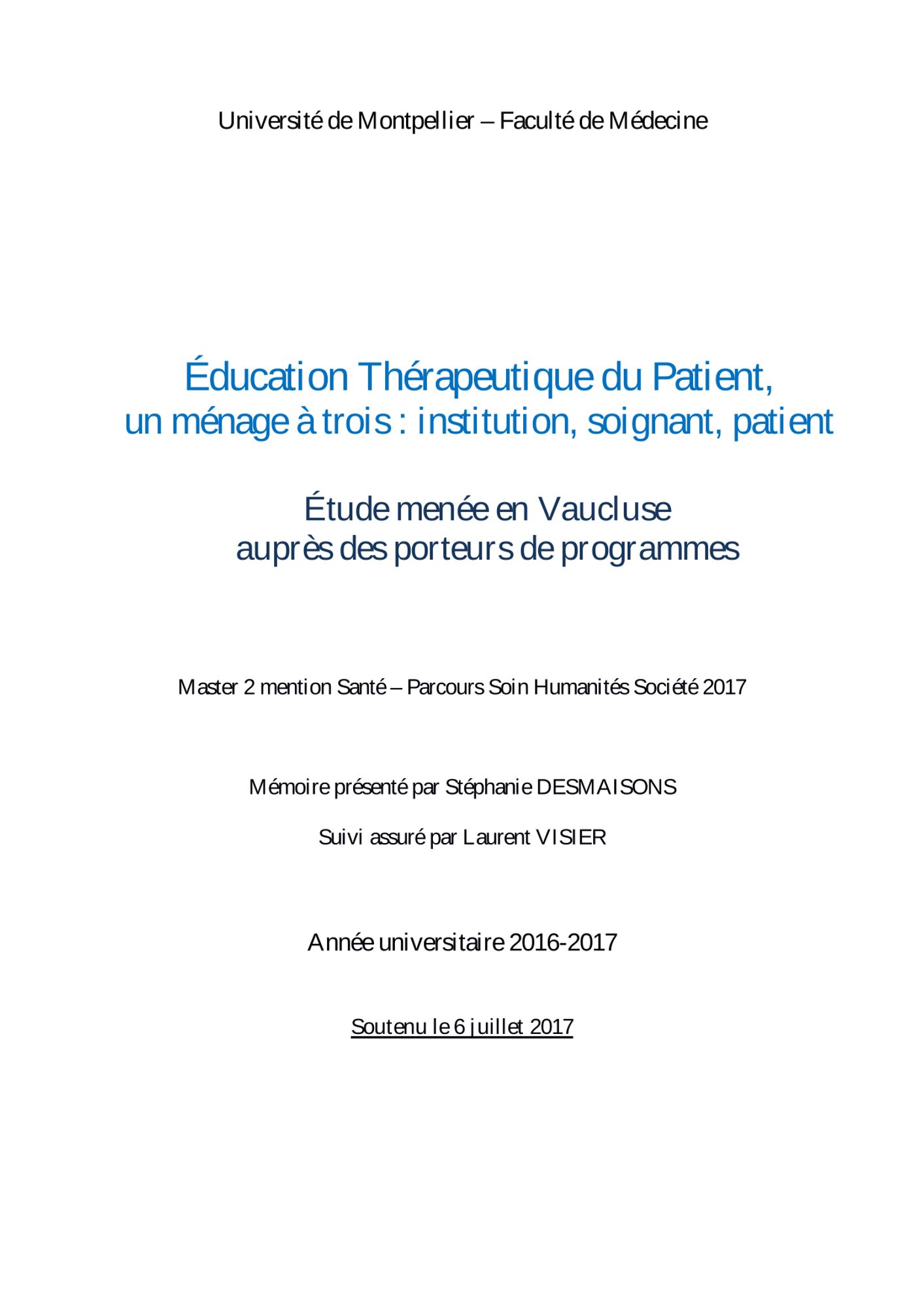Une enquête a été réalisée en 2017 pour mieux définir les besoins et les priorités de cet accompagnement. Cette enquête est précisée dans le mémoire "Education thérapeutique du patient, un ménage à trois : institution, soignant, patient. Etude menée en Vaucluse auprès des proteurs de programmes" disponible ci-contre.