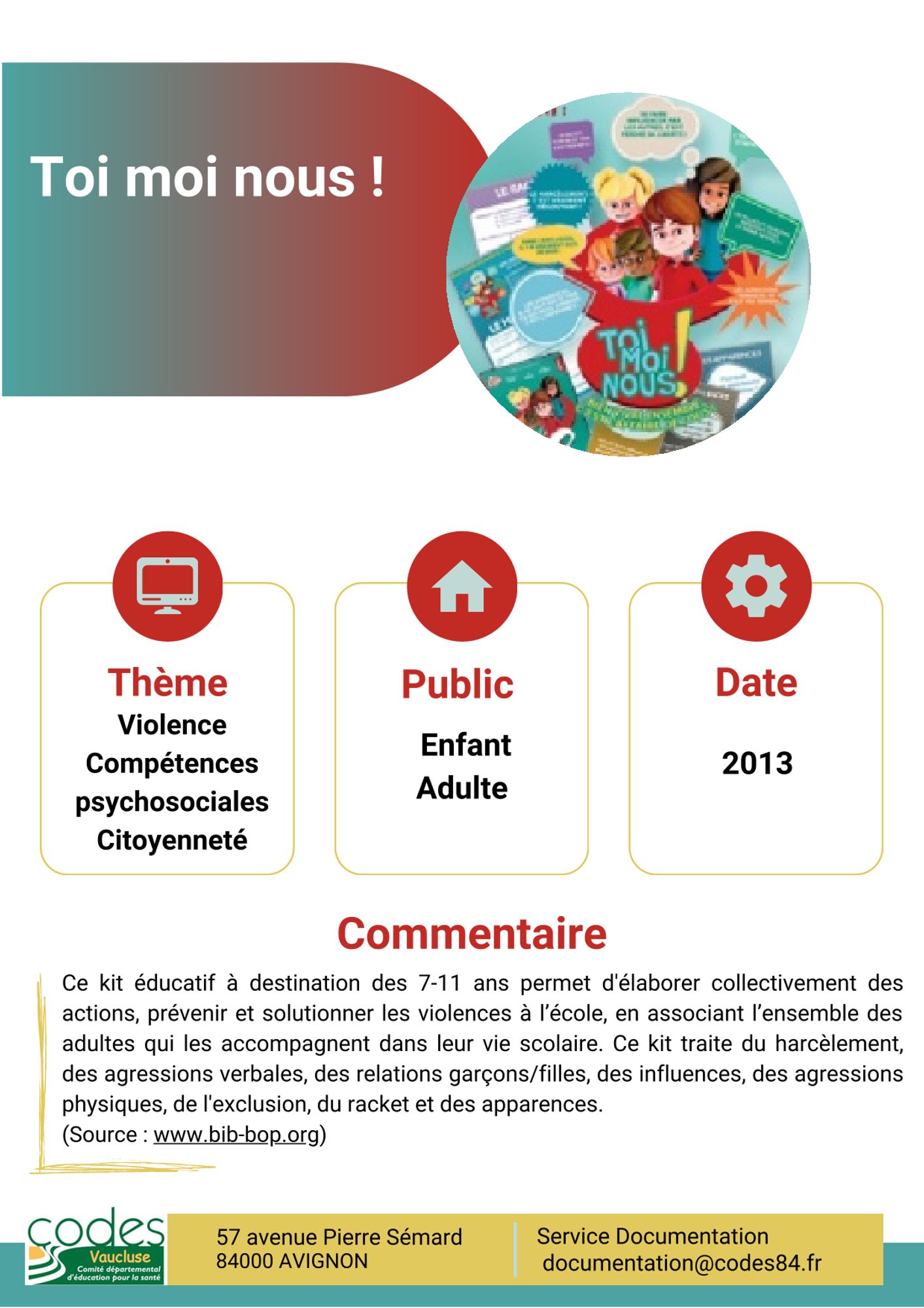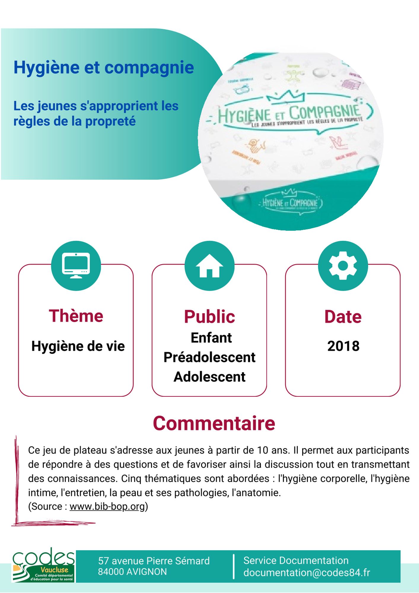 Enfants Dernière modification : 26 février 2024 Hygiène et compagnie. Les jeunes s'approprient les règles de la propreté (153.2 Ko) Toi moi nous ! (166.0 Ko) Les outils CPS - Mindful (250.6 Ko) Icofas. Intervenir pour des comportements nutritionnels favorables à la santé (530.0 Ko) Lapinou. Le lapin malin (206.3 Ko) Sur les pas de Tom et Lila (241.7 Ko) Papillagou et les enfants de Croque-Lune (341.5 Ko) Les pros du petit déjeuner (287.7 Ko) Grandir (311.8 Ko) Le sommeil de l'enfant (287.0 Ko) Léo et l'eau (307.1 Ko)