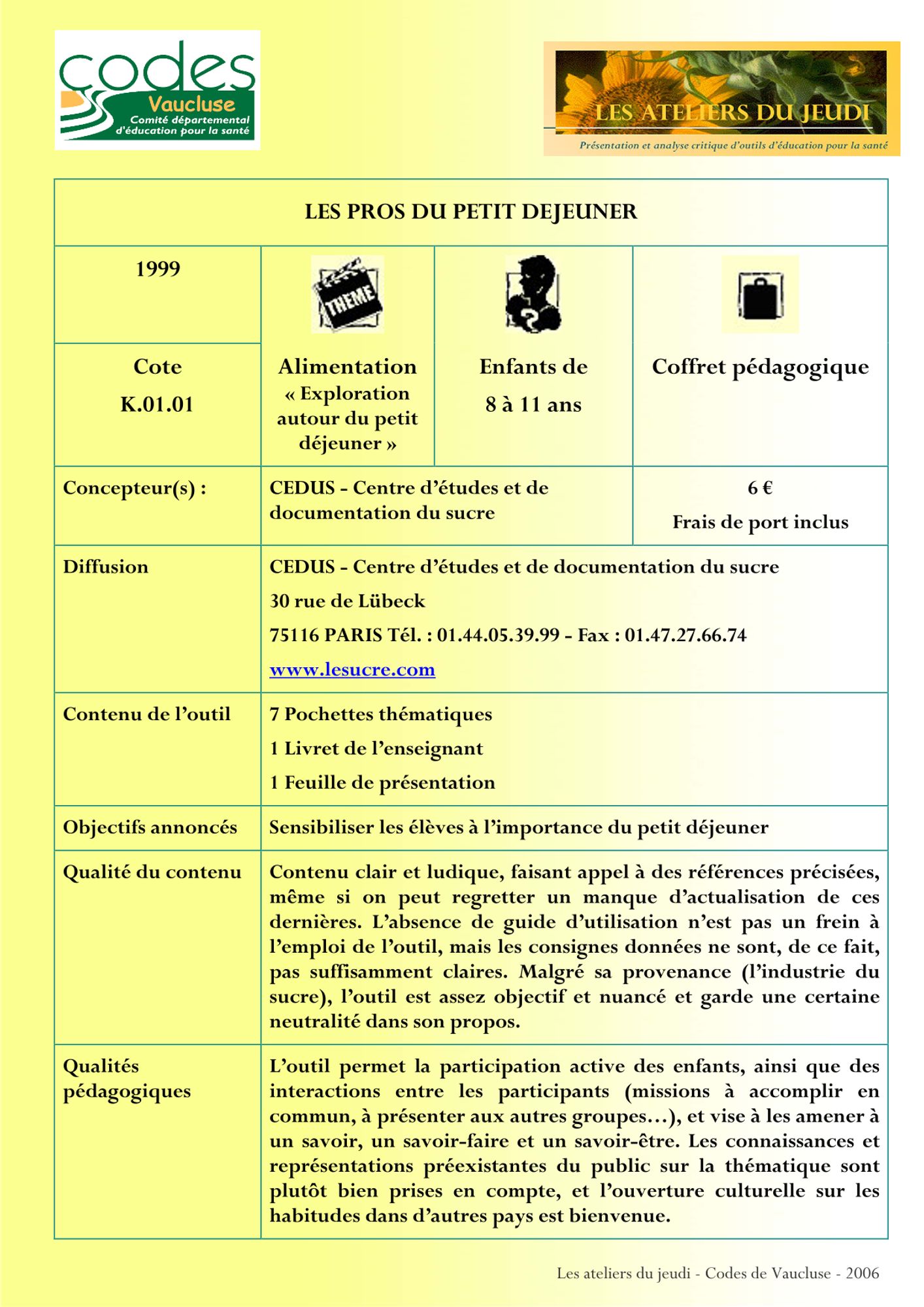 Alimentation - Activité physique Dernière modification : 26 février 2024 Icofas. Intervenir pour des comportements nutritionnels favorables à la santé (530.0 Ko) Atelier cuisine et alimentation durable. Guide pédagogique (248.1 Ko) Les pros du petit déjeuner (287.7 Ko)