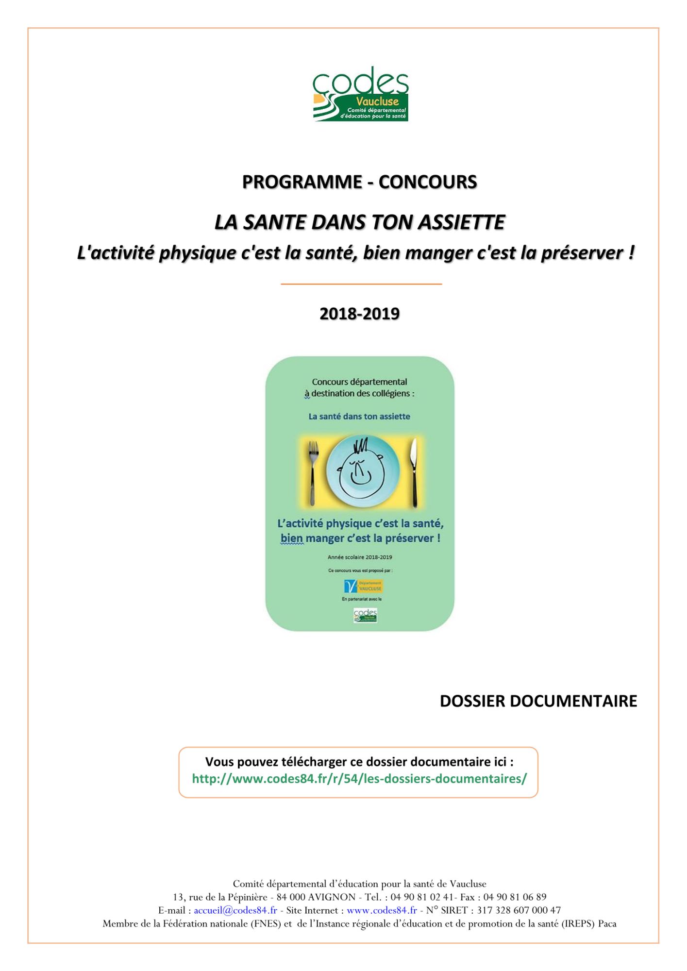 Ce dossier documentaire, non exhaustif, a été élaboré dans le cadre du programme-concours de prévention du surpoids et de l’obésité auprès des collégiens de Vaucluse "Actif dans ton assiette : mets tes baskets et mène l'enquête" élaboré par le CoDES de Vaucluse pour l’année scolaire 2018-2019.