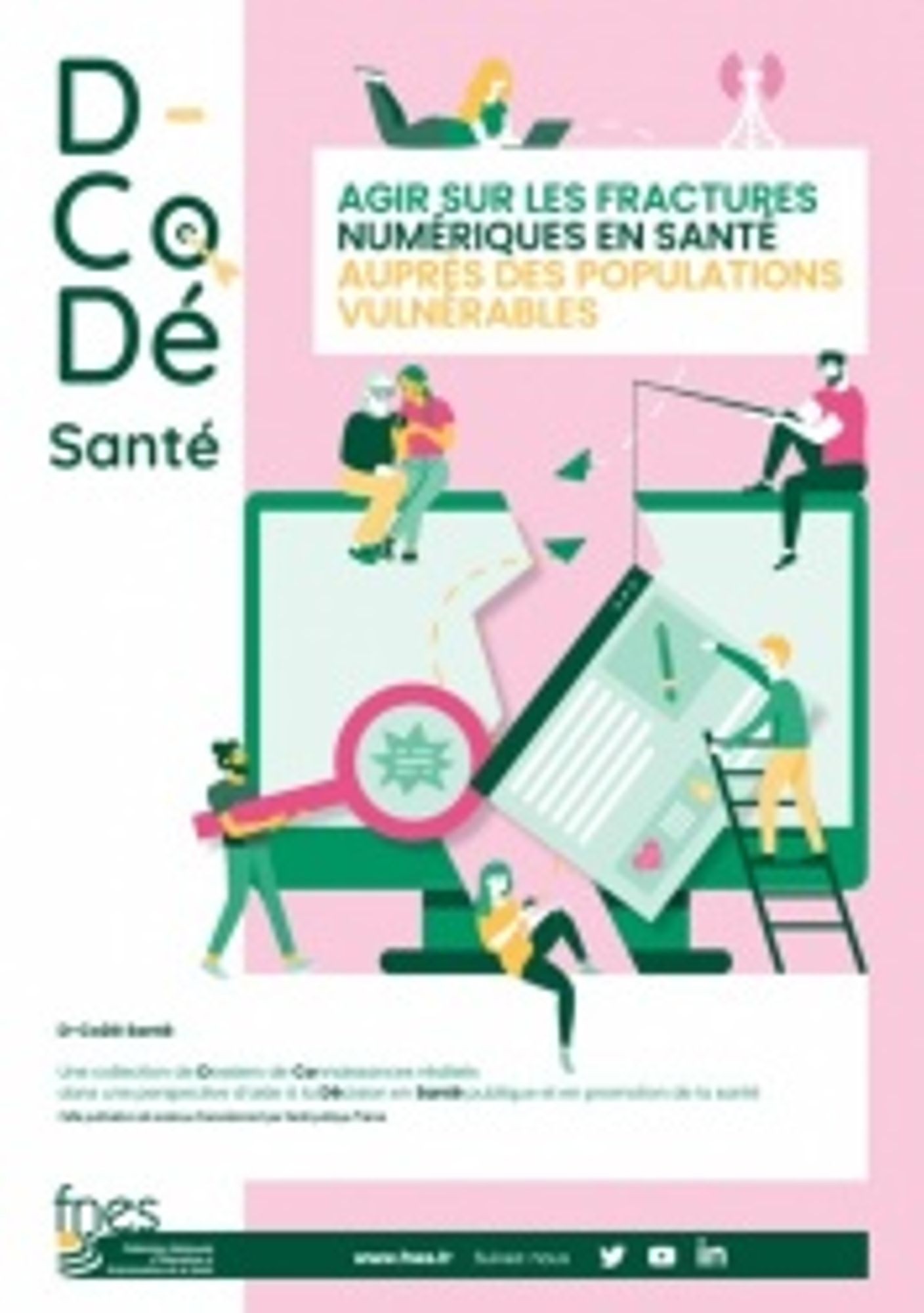 Ce dossier de connaissances est consacré à la question de la fracture numérique en santé. Il complète la collection D-CoDé Santé de la Fnes conçue dans une perspective d’aide à la décision en santé publique et en promotion de la santé. Ce dossier est structuré en 6 grandes parties : 1) des points clés pour les décideurs sous forme d'infographie reprenant les essentiels du dossier ; 2) une introduction contextualisée avec des définitions et des données chiffrées ; 3) des éléments tirés de la littérature scientifiques et des récits d'actions ; 4) des principes d’action et d’intervention en promotion de la santé pour réduire les fractures numériques ; 5 ) le témoignage d’un décideur, cheffe de projet ; et enfin 6) des ressources bibliographiques de référence sur lesquelles repose l’ensemble du dossier.