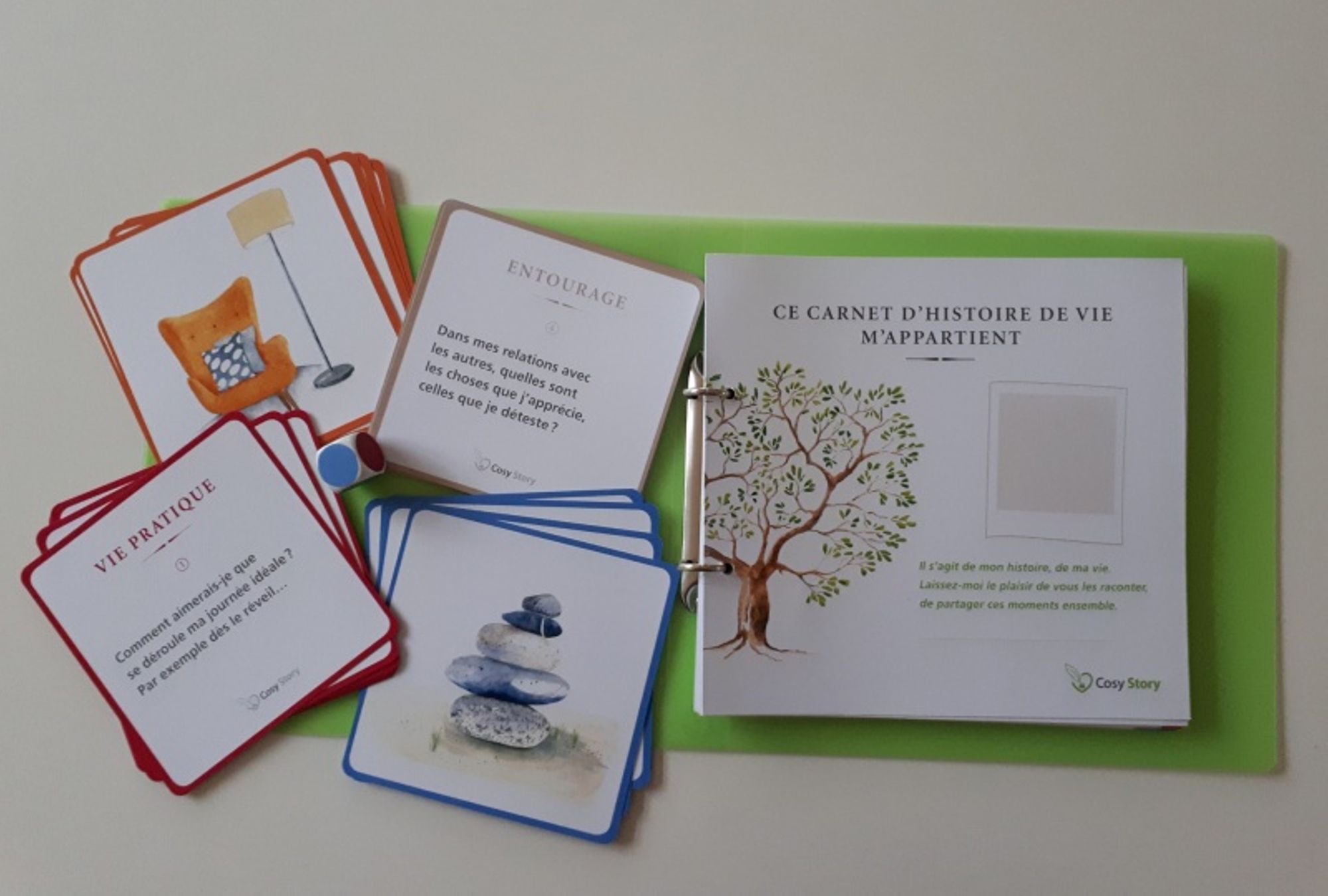 Collation : 1 classeur histoire de vie, 1 classeur carnet de l'animateur, 1 dé avec face en couleurs, 35 cartes questions