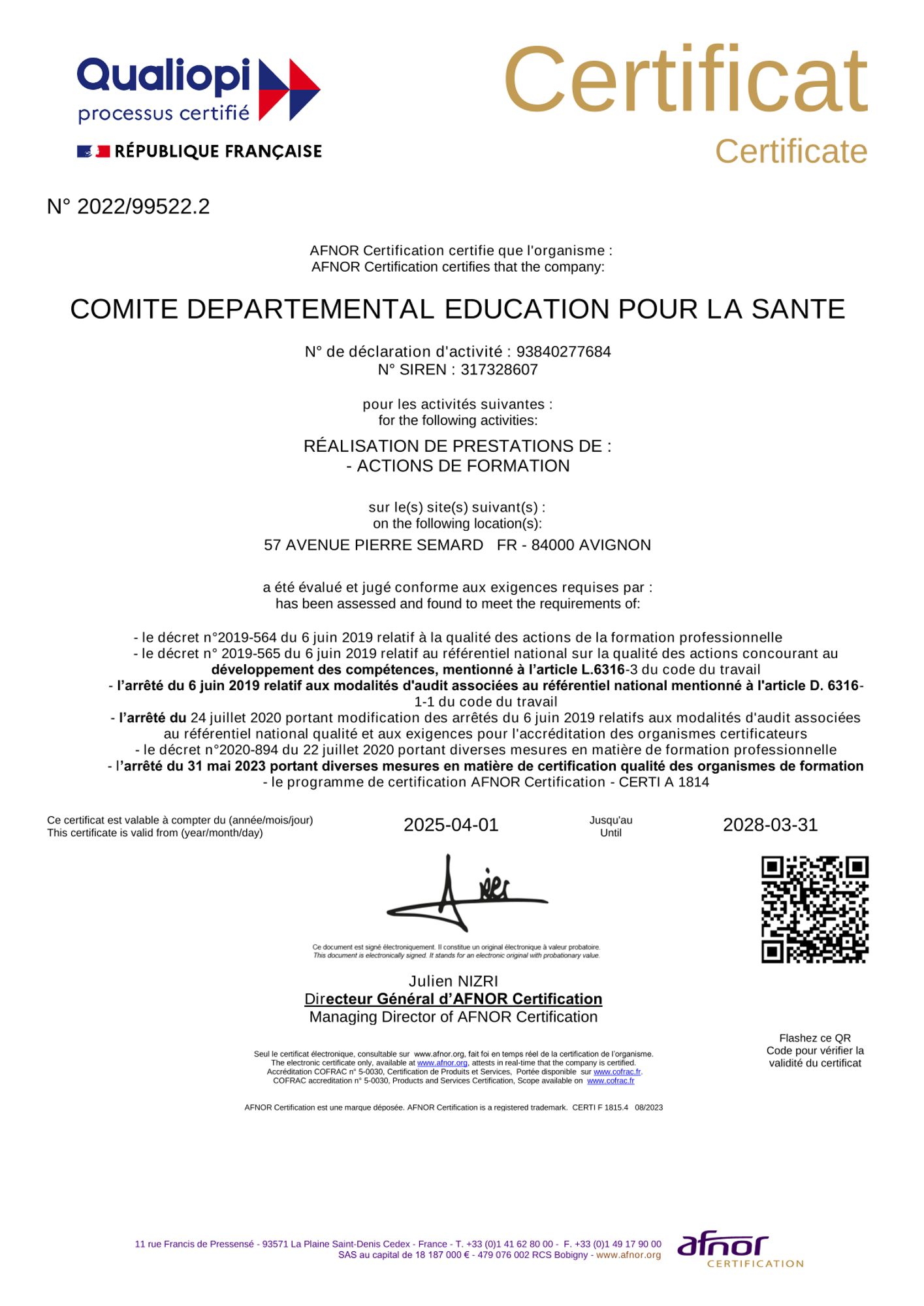 Le CoDES de Vaucluse est certifié Qualiopi depuis avril 2022. Votre formation peut donc être prise en charge par votre organisme de formation professionnelle.