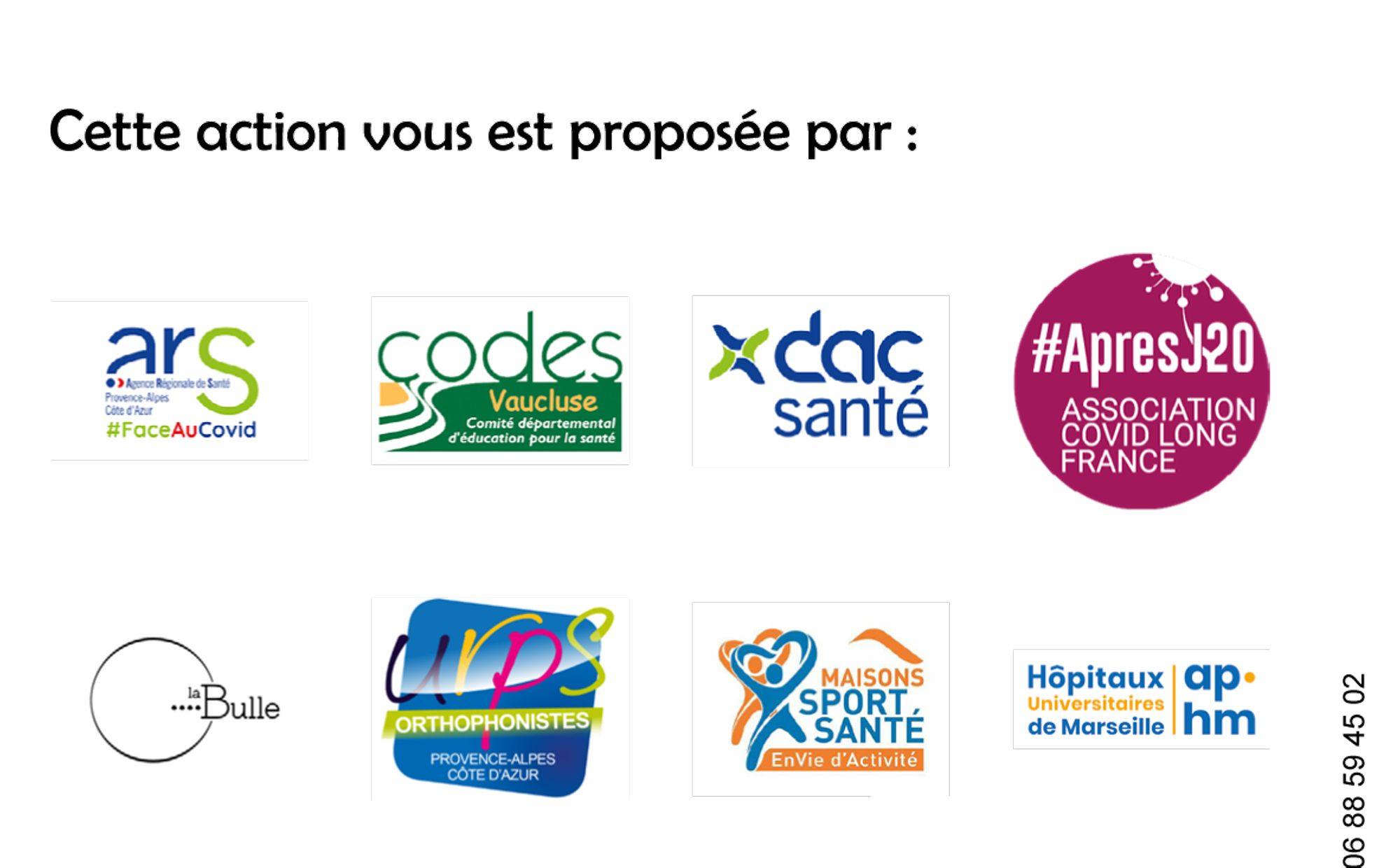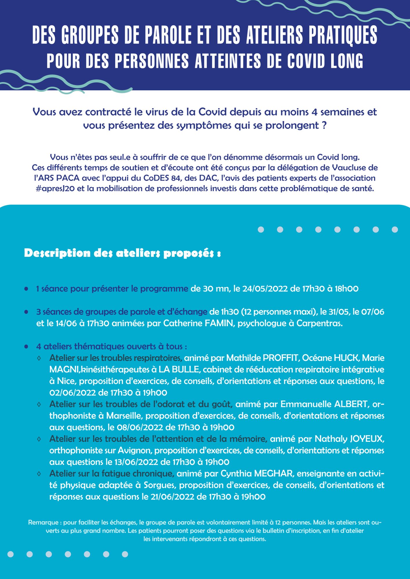 Ces différents temps de soutien, d’écoute et d'information ont été conçus par la délégation de Vaucluse de l’ARS PACA avec l’appui du CoDES 84, des DAC, l’avis des patients experts de l’association #apresJ20 et la mobilisation de professionnels investis dans cette problématique de santé.