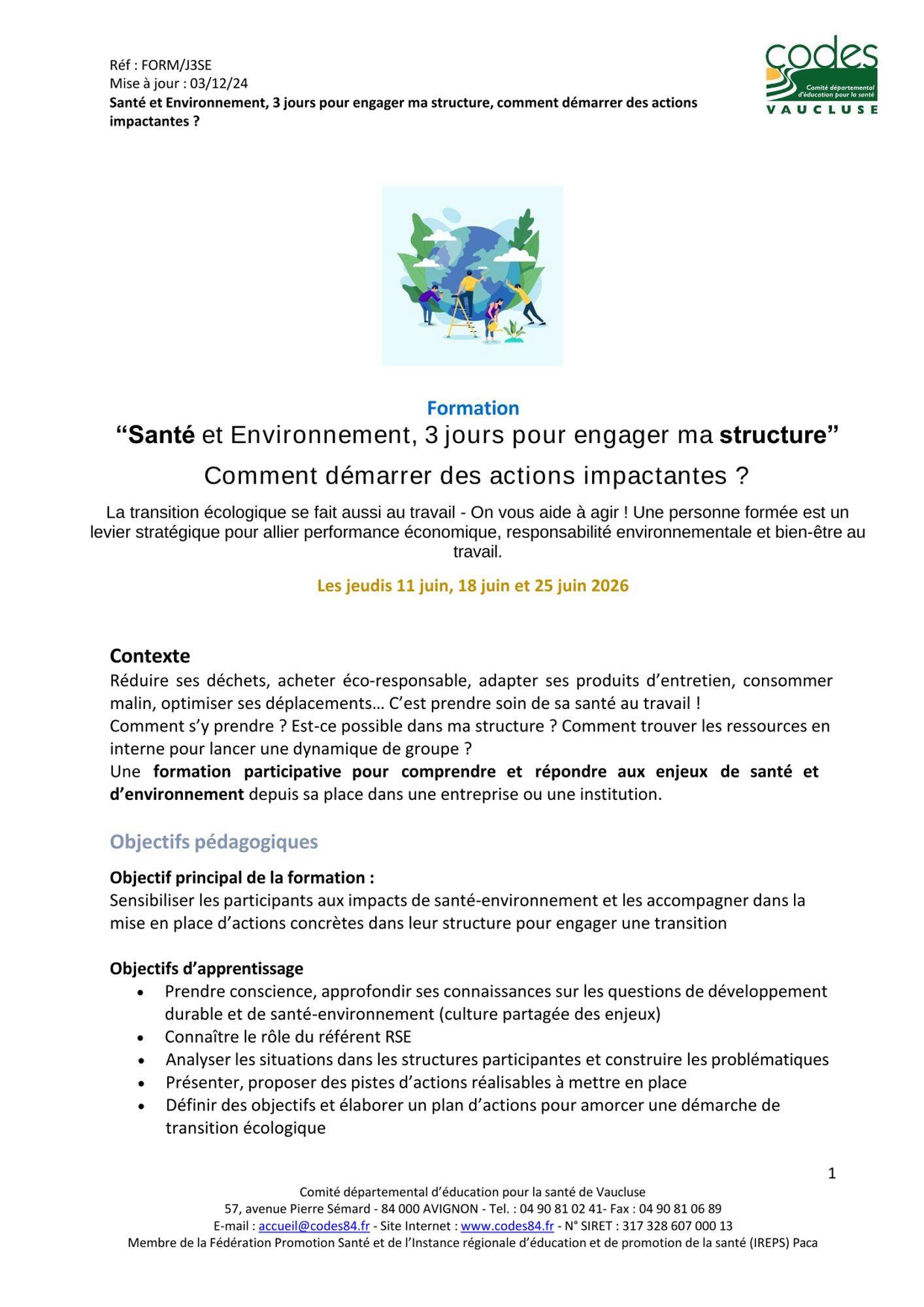 Pour toute demande de devis ou de facture, merci de contacter le CoDES : 04 90 81 02 41 ou par mail accueil@codes84.fr