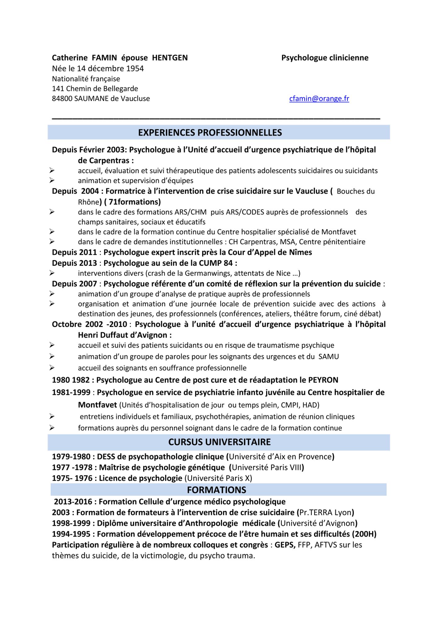Catherine FAMIN Psychologue clinicienne Dernière modification : 12 mars 2025 Voir le CV de Catherine Famin (469.9 Ko) Formation assurée au CoDES