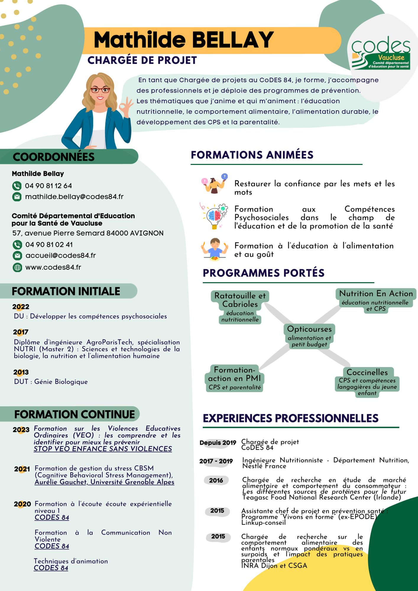 Mathilde BELLAY Chargée de projet Dernière modification : 12 mars 2025 Voir le CV de Mathilde Bellay (228.9 Ko) Formation assurée au CoDES Renforcer les compétences psychosociales : de l’intention à l’animation auprès des publics 17, 19 et 20 mars 2026 Cette formation de trois jours a pour objectif de permettre aux professionnels du champ de l’éducation de la santé d’intégrer les compétences psychosociales dans leurs pratiques et dans des actions destinées à renforcer les compétences psychosociales de leur public. Restaurer la confiance par les mets et les mots 2010-2024 - Programme terminé Ce programme / formation permet d'accompagner les publics en situation de précarité sur les questions d’alimentation et d’activité physique, avec comme levier les compétences psychosociales