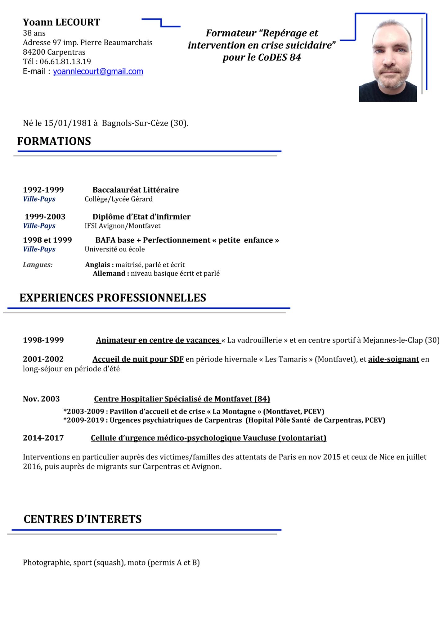 Yoann LECOURT Infirmier Dernière modification : 12 mars 2025 Voir le CV de Yoann Lecourt (551.5 Ko) Formation assurée au CoDES