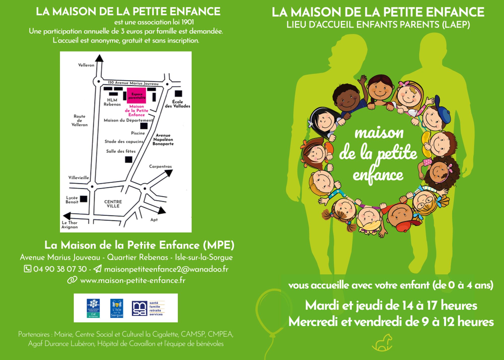 La maison de la Petite Enfance (MPE) - Le Lieux d’Accueil Enfant Parent (LAEP) propose un accueil enfants/parents de 0 à 4 ans, un temps convivial de rencontres, de jeux et d'échanges... (libre, gratuit et sans inscription)