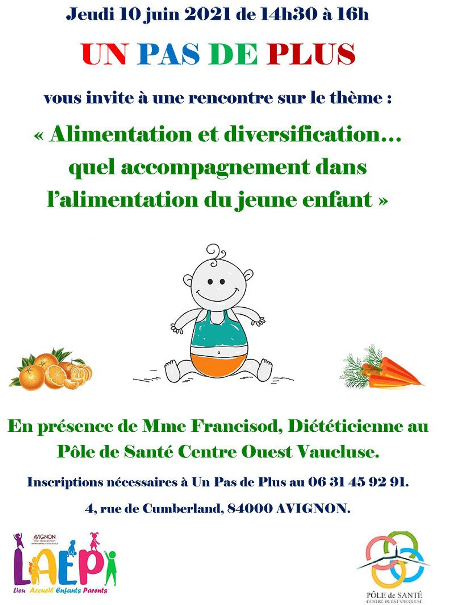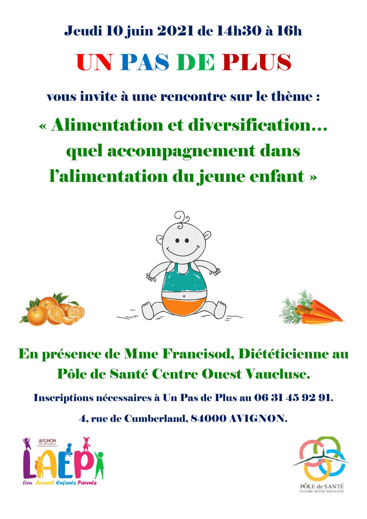 Cette rencontre, organisée par le Lieux d'accueil enfant parent - LAEP Un pas de plus à Avignon, a pour thème l'alimentation du jeune enfant, en présence de Mme Francisod, Diététicienne au Pôle de Santé Centre Ouest Vaucluse.