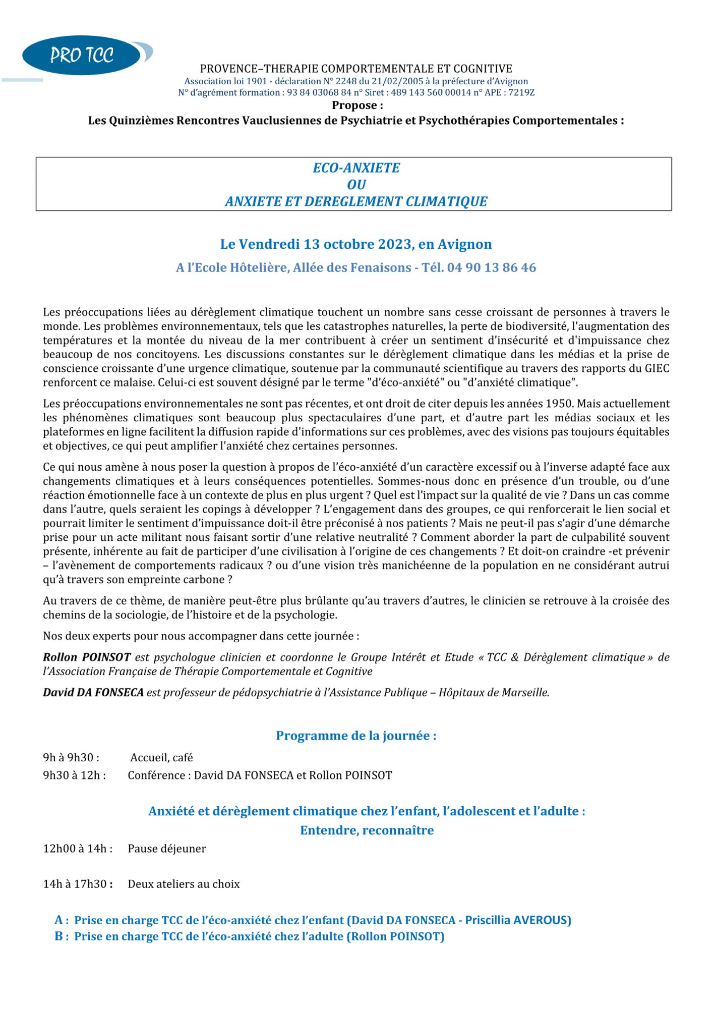 Les 15èmes Rencontres Vauclusiennes de Psychiatrie et Psychothérapies Comportementales, organisées par Provence Thérapie comportementale et cognitive (Pro-TCC), auront pour objectif de s'interroger à propos de l’éco-anxiété d’un caractère excessif ou à l’inverse adapté face aux changements climatiques et à leurs conséquences potentielles. Il s'agira de diférencier le trouble de la réaction émotionnelle face à un contexte de plus en plus urgent, et d'en comprendre l’impact sur la qualité de vie afin de développer les stratégies de copings. Ces rencontres auront lieu le :