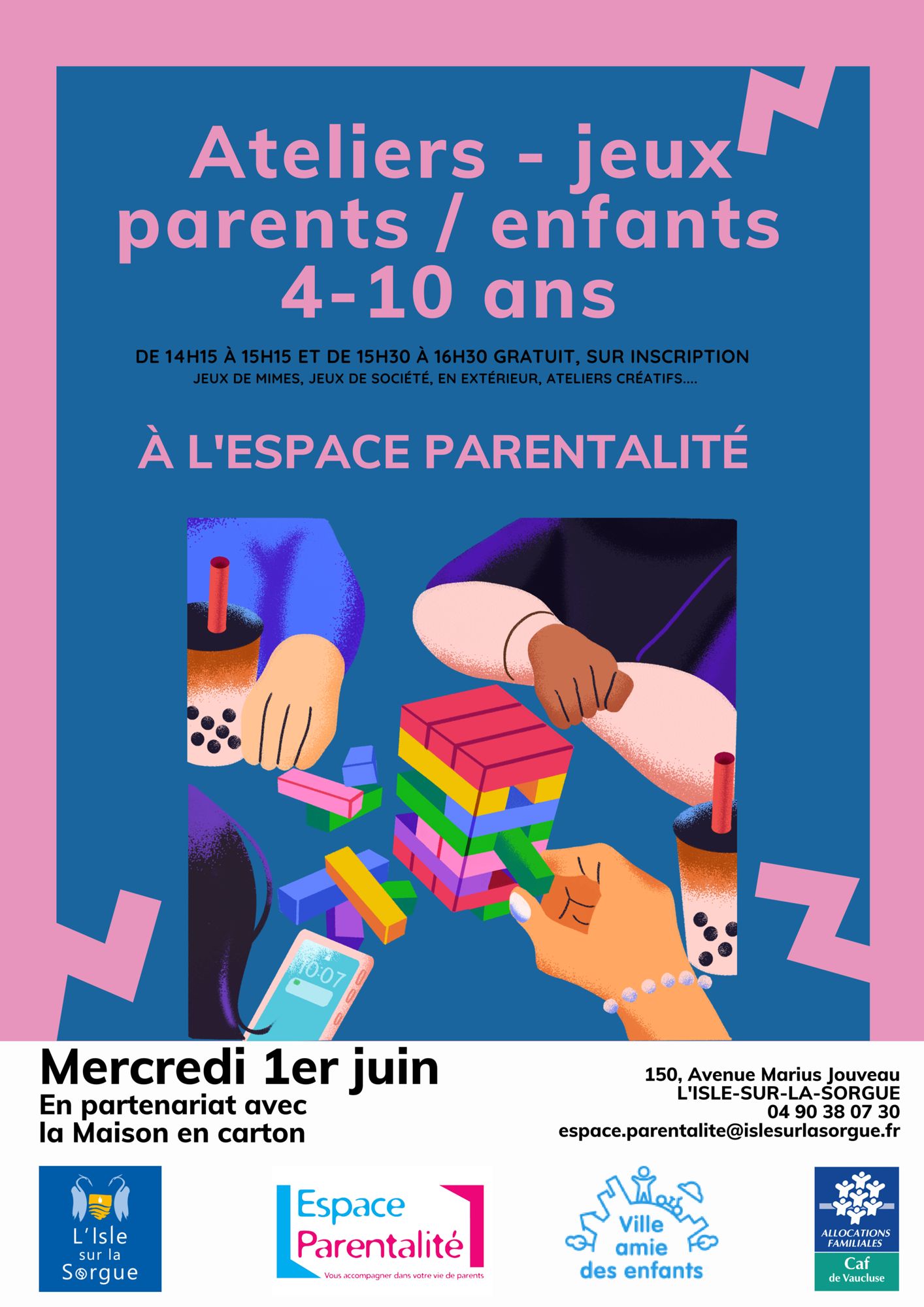 L'Espace Parentalité - L'Isle sur la Sorgue organise un atelier jeux enfants/parents de 4 à 10 ans autour de jeux de mimes, jeux de société, en extérieur, ateliers créatifs, etc :