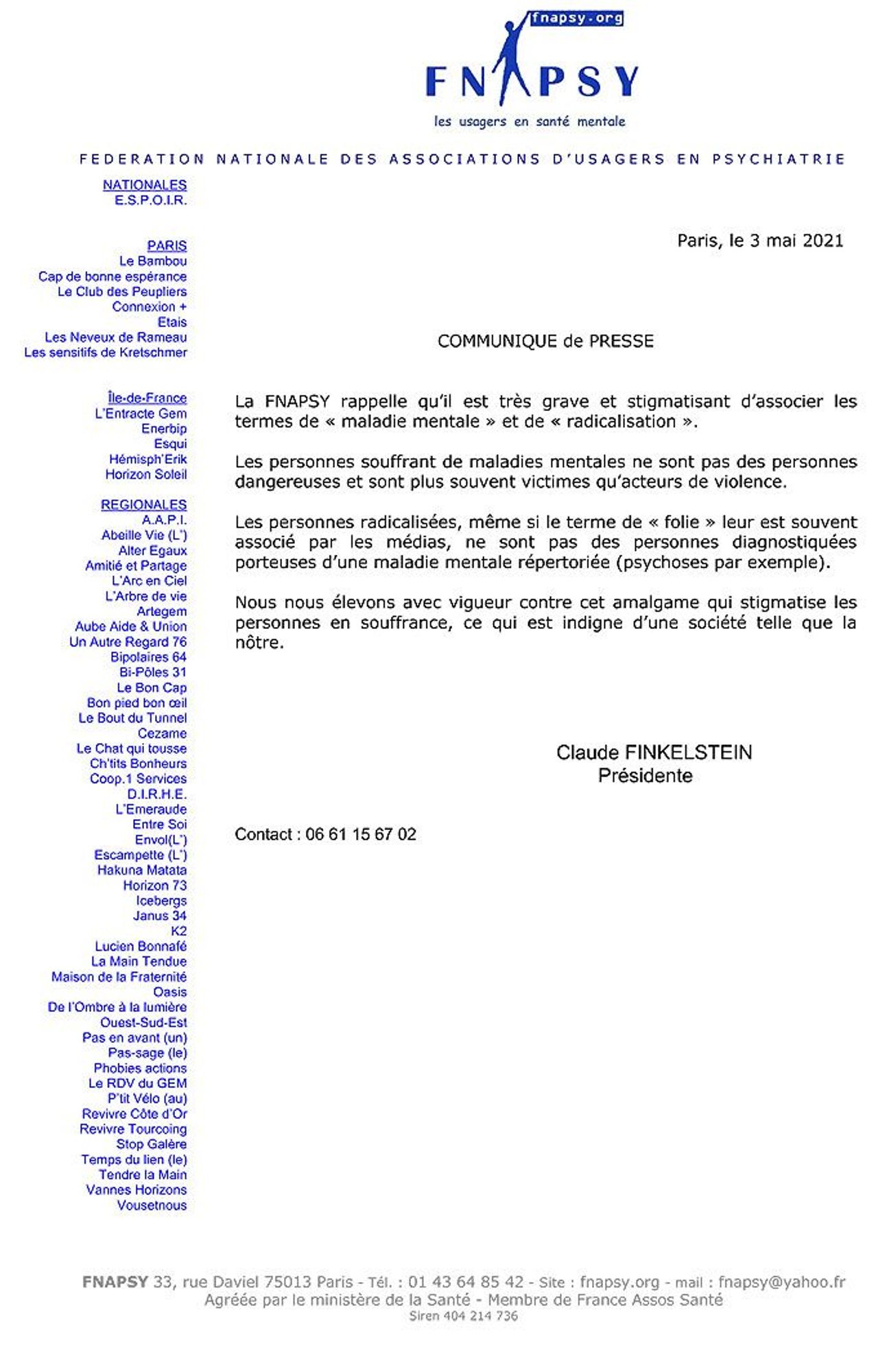La FNAPSY (Fédération nationale des associations d'usagers en psychiatrie) rappelle qu’il est très grave et stigmatisant d’associer les termes de "maladie mentale" et de "radicalisation". Les personnes souffrant de maladies mentales ne sont pas des personnes dangereuses et sont plus souvent victimes qu’acteurs de violence.