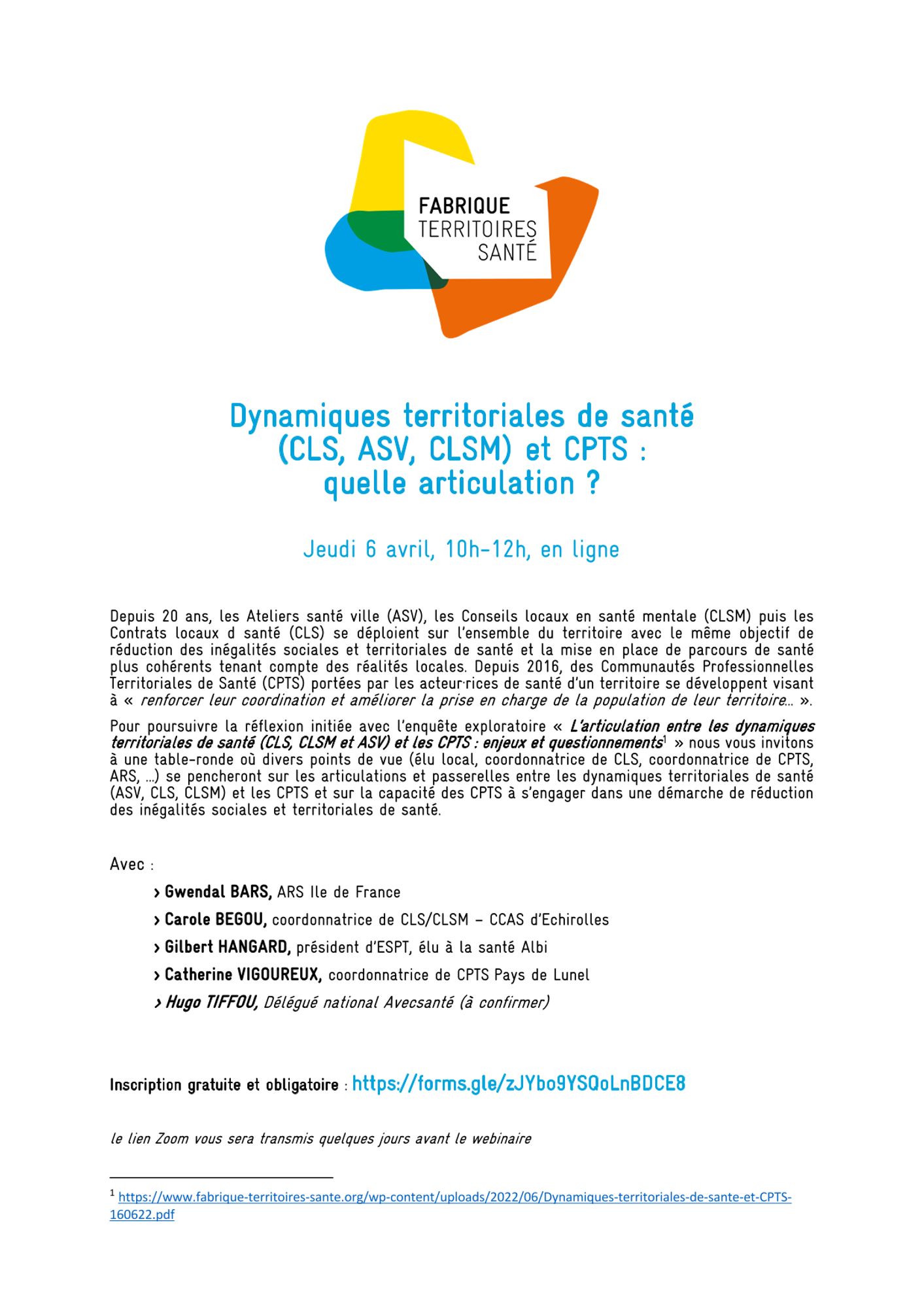 Pour poursuivre la réflexion initiée avec l’enquête exploratoire "L’articulation entre les dynamiques territoriales de santé (CLS, CLSM et ASV) et les CPTS : enjeux et questionnements" Fabrique territoires santé organise une table-ronde où divers points de vue : élu local, coordonnatrice de CLS, coordonnatrice de CPTS, ARS… se pencheront sur les articulations et passerelles entre les dynamiques territoriales de santé (ASV, CLS, CLSM) et les CPTS et sur la capacité des CPTS à s’engager dans une démarche de réduction des inégalités sociales et territoriales de santé, le :