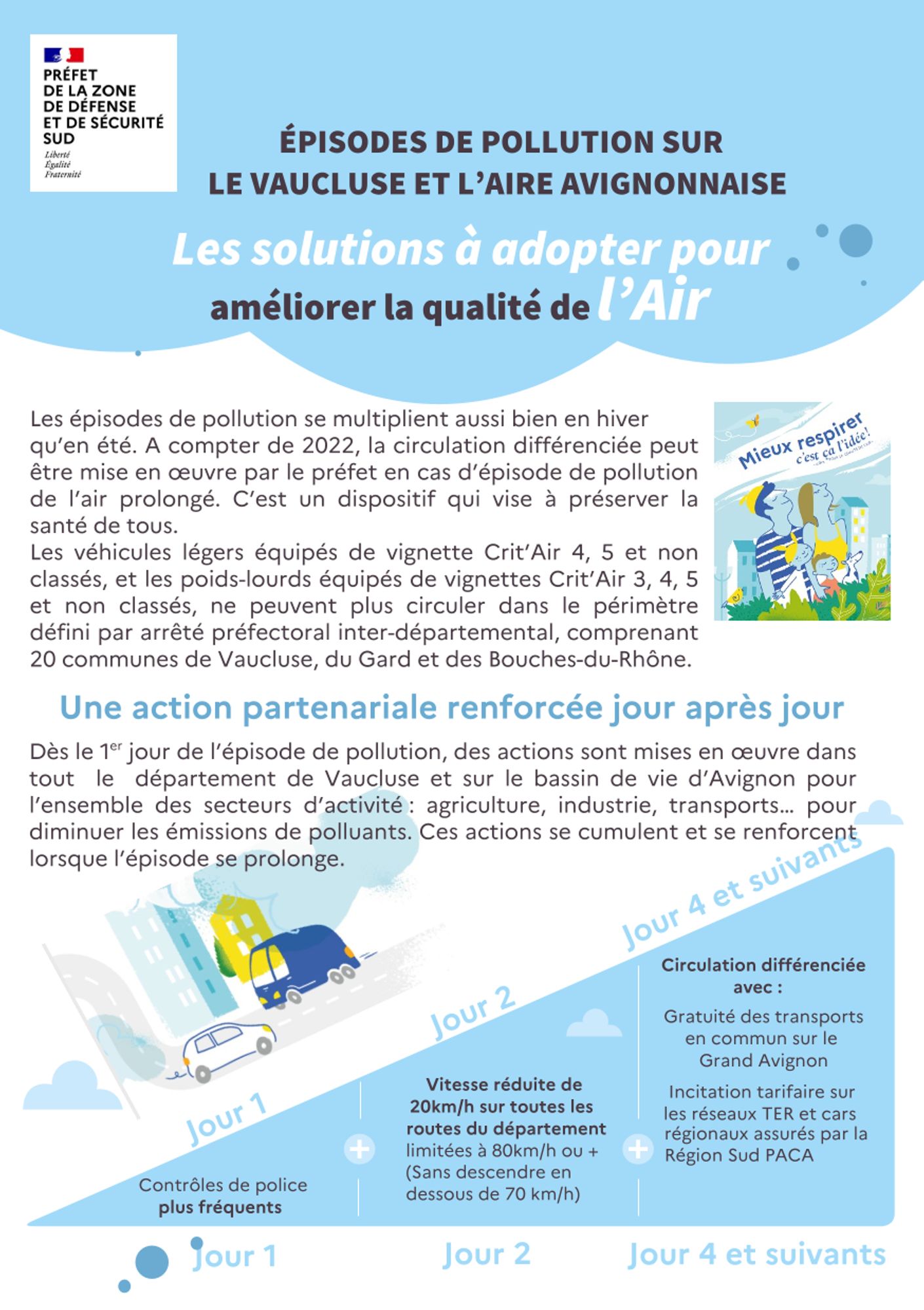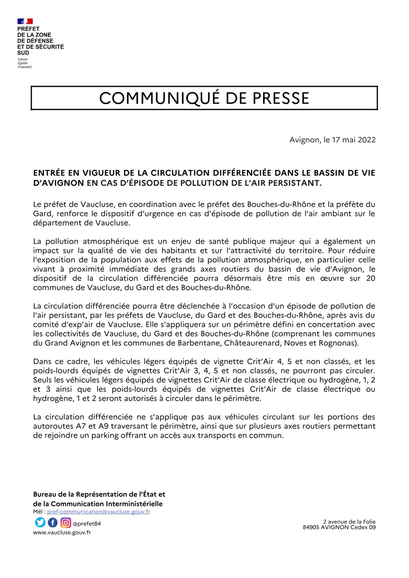 Dans le cadre du Plan Urgence Transports (PUT), la préfecture du Vaucluse diffuse un communiqué de presse relatif au dispositif prévu pour l'entrée en vigueur de la circulation différenciée dans le bassin de vie d'Avignon en cas d'épisode de pollution de l'air persistant.