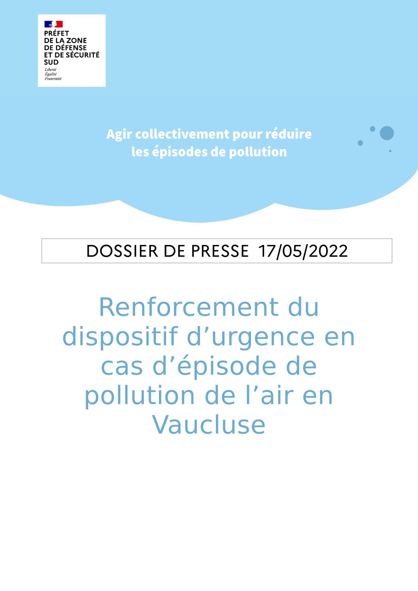 - une brochure et un dossier de presse relatifs au renforcement du dispositif d'urgence en cas d'épisode de pollution de l'air persistant ;