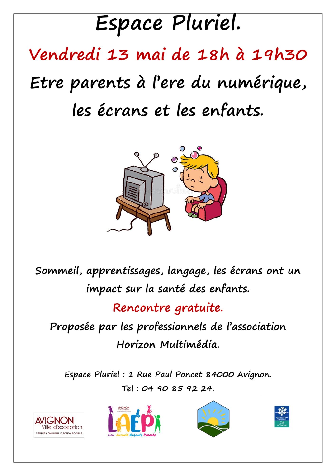 Organisée par le Lieux d’accueil enfant parent – LAEP Espace Pluriel à Avignon, la rencontre sur le thème “Être parents à l'ère du numérique, les écrans et les enfants“ est proposée par les professionnels de l'association Horizon Multimédia. Cette rencontre se déroulera le :