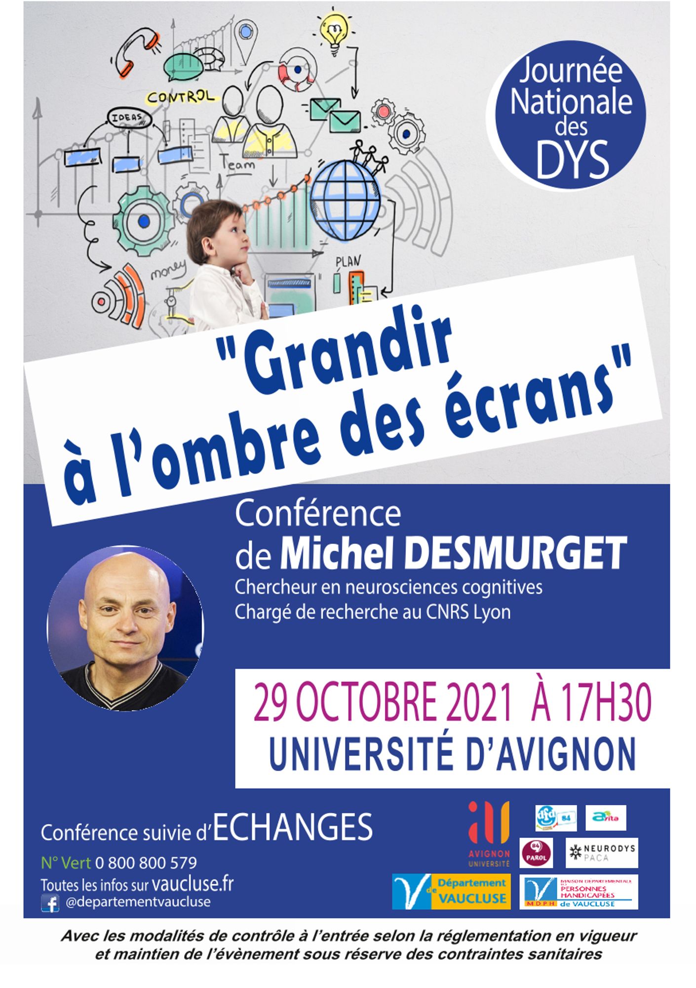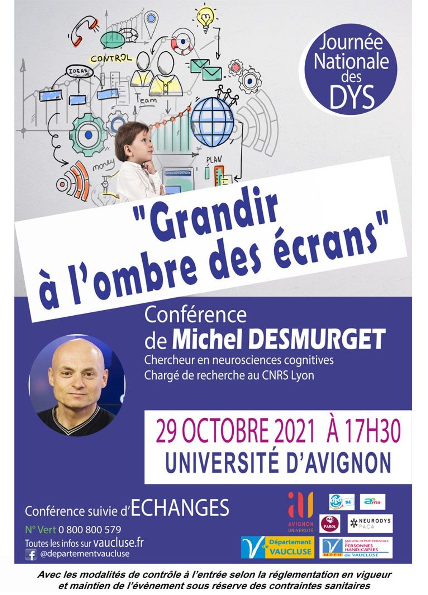 A l'occasion de la 15ème Journée nationale des Dys, et plus largement des troubles spécifiques des apprentissages, la Maison Départementale des Personnes Handicapées de Vaucluse et tous ses partenaires institutionnels et associatifs RésoDYS, AVITA, Parol 84, DFD 84… organisent une conférence "Grandir à l’ombre des écrans" le :