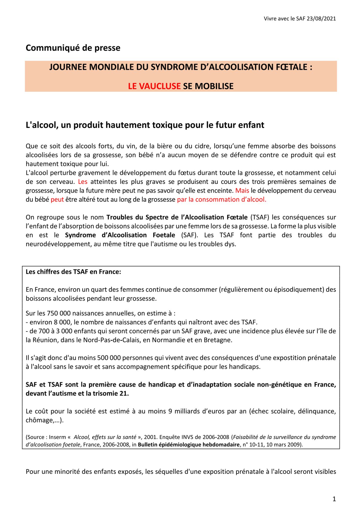 En 2019 un groupe de travail sur le sujet "Alcool et grossesse" a vu le jour en Vaucluse, à l'initiative de l'association Vivre avec le SAF, soutenue par l'hôpital psychiatrique de Montfavet. Il rassemble des membres des organismes du secteur médical et médico-social en Vaucluse. Ce groupe de travail est animé par le CODES 84, Comité départemental d’éducation pour la santé. Ces rencontres ont permis d'établir un état des lieux (ressources mobilisables, actions réalisées, attentes des partenaires) et de définir des actions répondant aux priorités du territoire.
