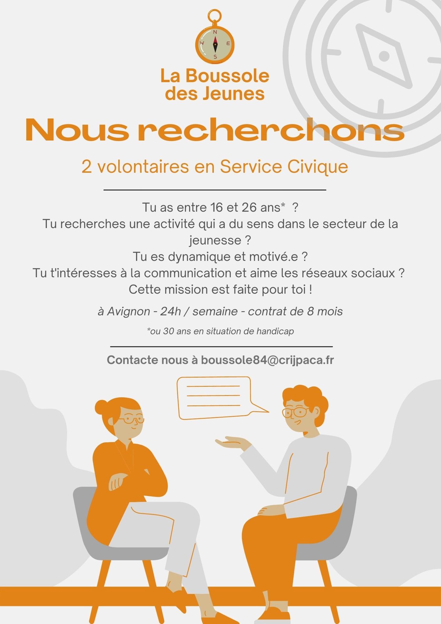 Afin d’accompagner l’équipe dans le développement de la Boussole des Jeunes en Vaucluse, notamment en favorisant le lien avec le public et en participant à la communication autour de l’outil, ce service de la Direction de la Jeunesse, de l’Éducation Populaire et de la Vie associative (DJEPVA) recrute deux volontaires du service civique pour mener à bien ses missions.