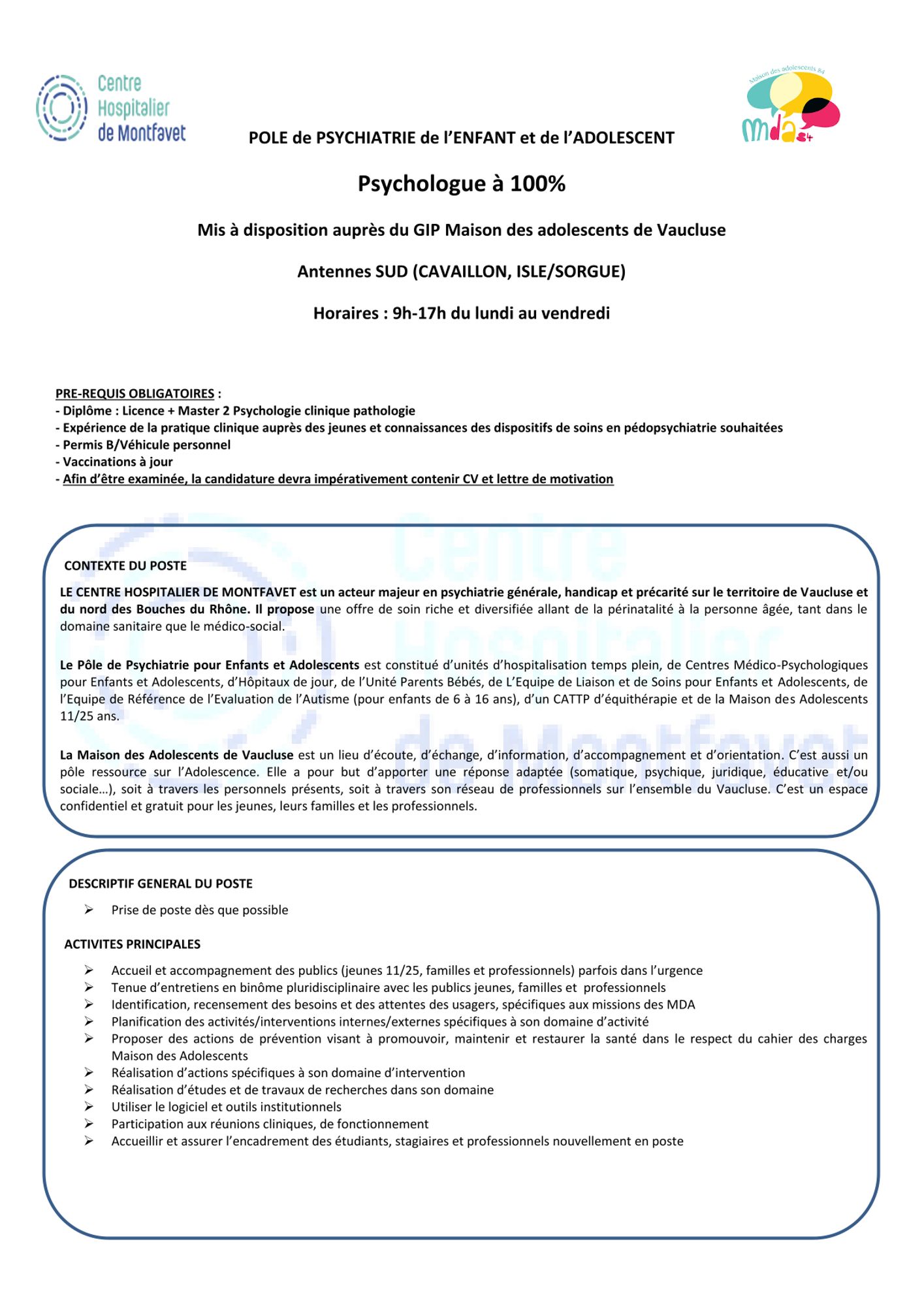 La Maison des adolescents de Vaucluse recrute un psychologue (H/F) à temps plein