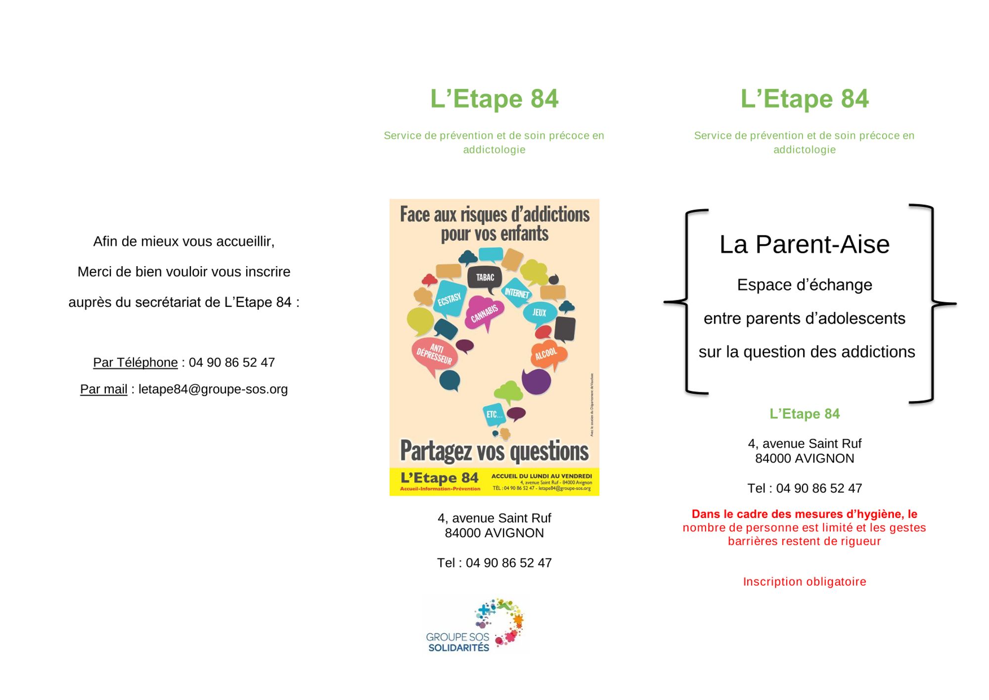 L’Etape 84 propose également un soutien aux parents/proches, l’objectif étant de les informer, mais aussi de les accompagner et de les aider dans leurs questionnements, leurs inquiétudes, leurs difficultés …