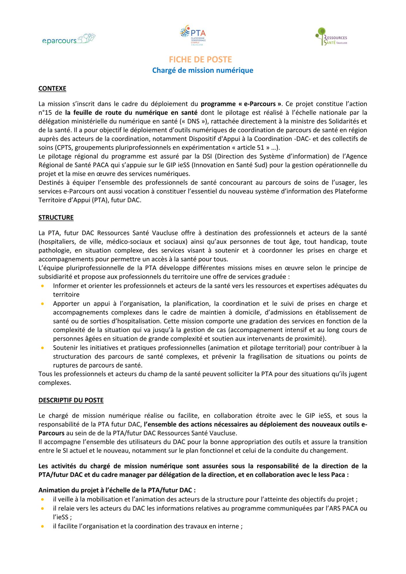 Le chargé de mission numérique réalise ou facilite, en collaboration étroite avec le GIP ieSS, et sous la responsabilité de la PTA futur DAC, l’ensemble des actions nécessaires au déploiement des nouveaux outils e-Parcours au sein de de la PTA/futur DAC Ressources Santé Vaucluse.