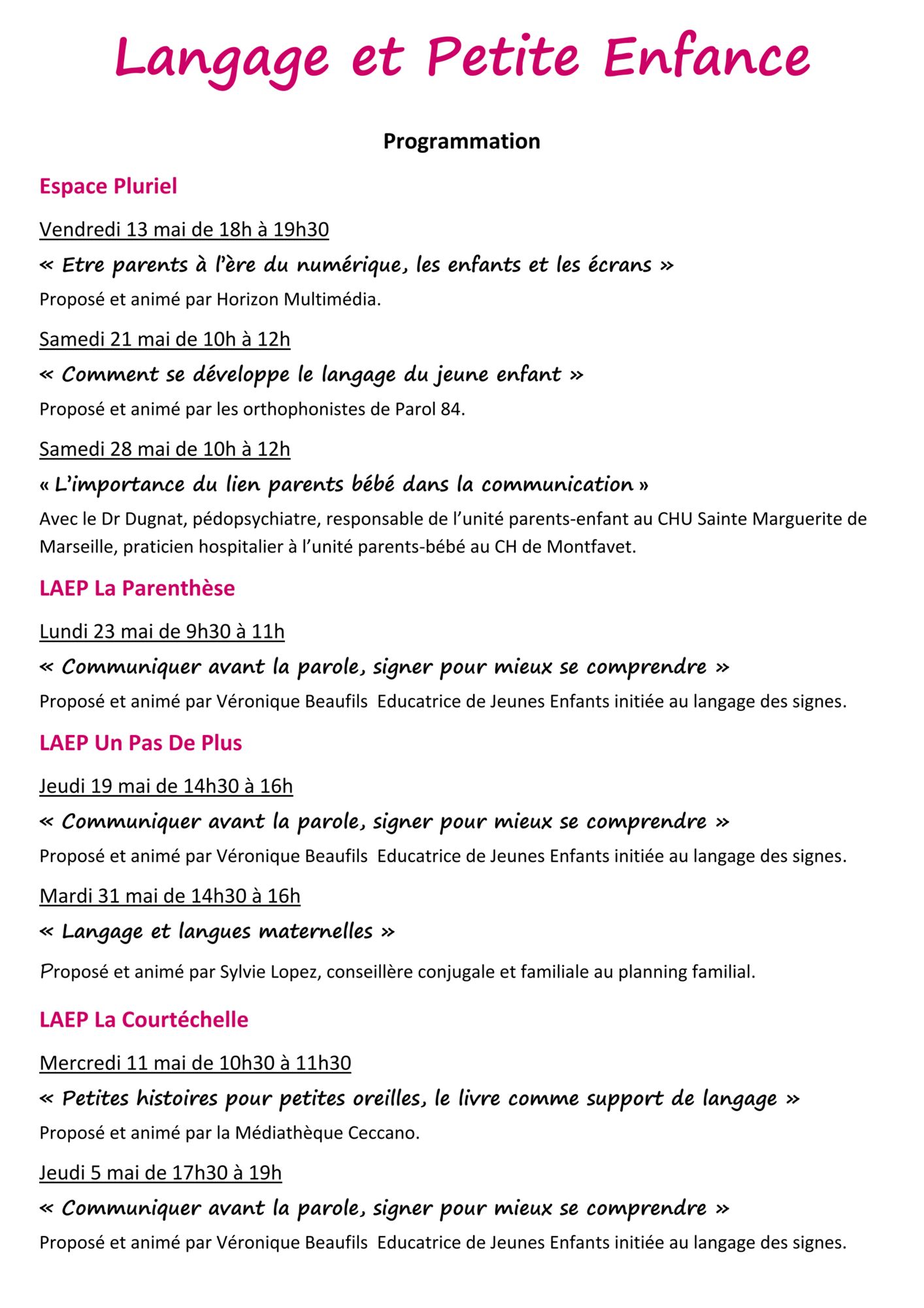 Ces conférences, qui aborderont notamment la communication non verbale, le langage des signes, l'arrivée des premiers mots, le développement du langage, les écrans ou encore l'importance du lien parent-bébé auront lieu à l'Espace Pluriel, le LAEP La Parenthèse, le LAEP Un Pas De Plus et le LAEP La Coutéchelle.