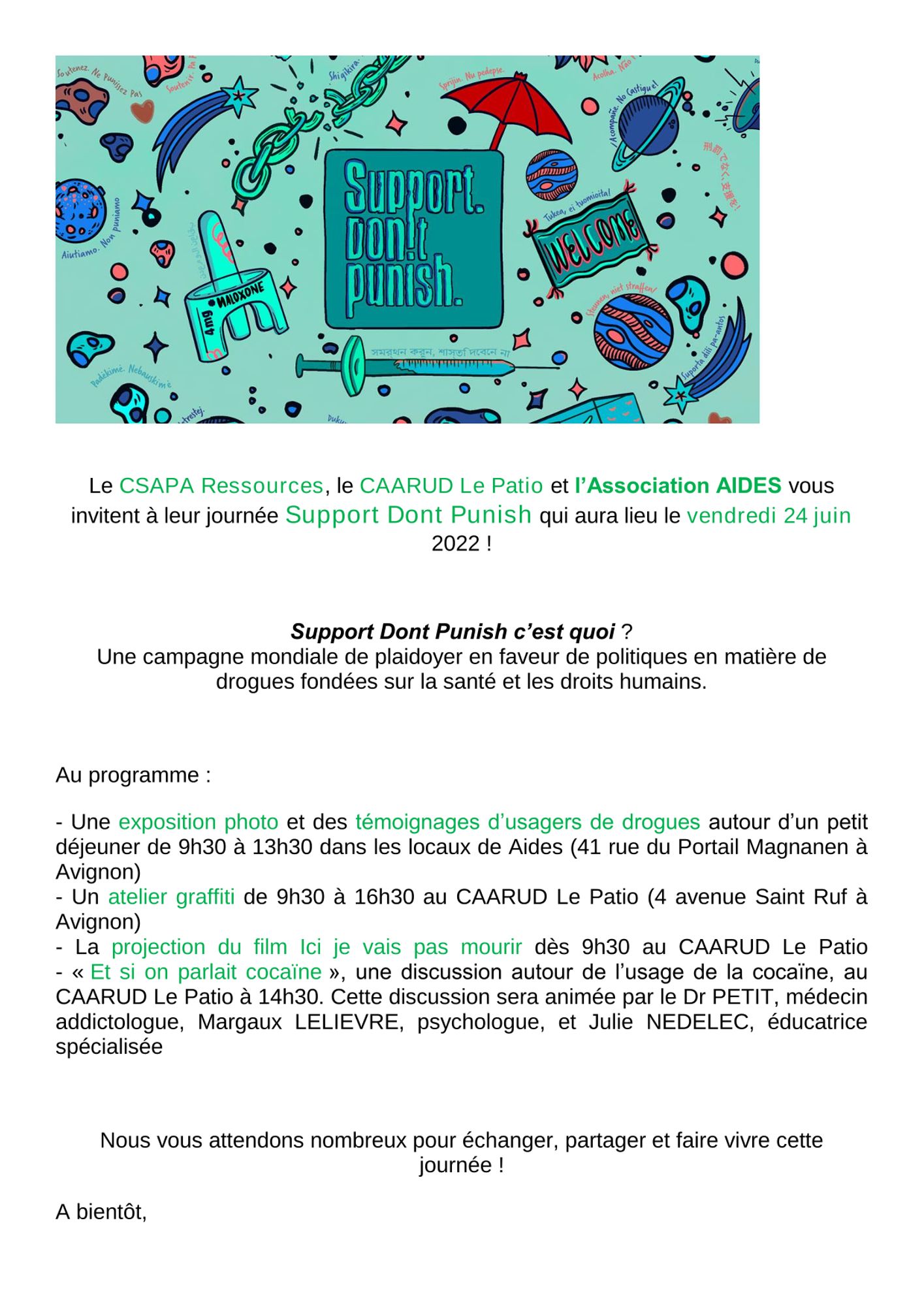 Le CSAPA Ressources, le CAARUD Le Patio et l’Association AIDES vous invitent à leur journée Support Dont Punish qui aura lieu le :
