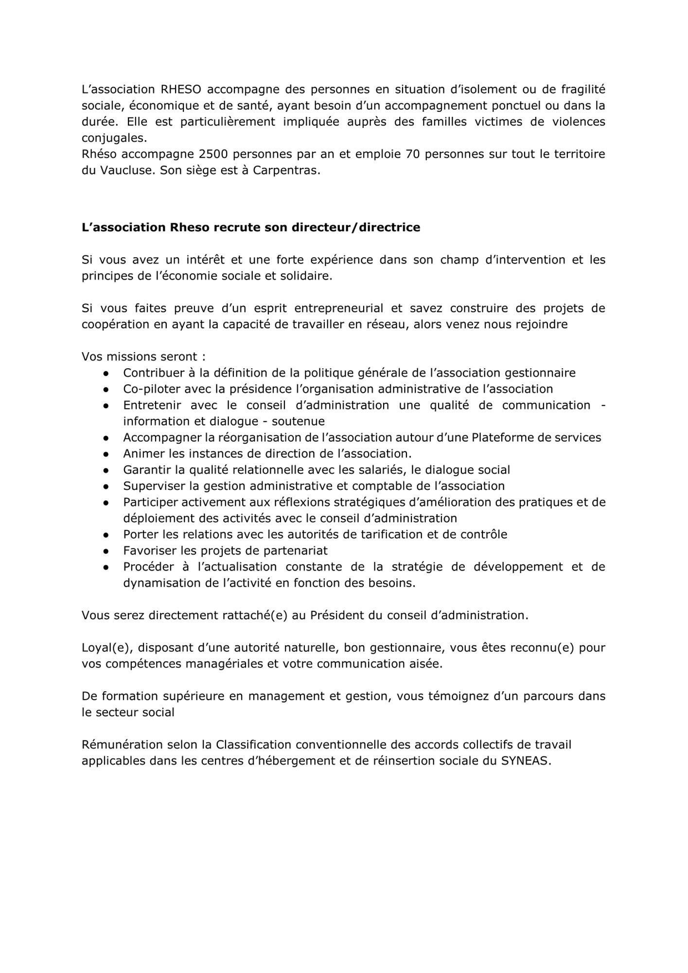 L'association Rhéso recrute, sur la commune de Carpentras dans le Vaucluse :