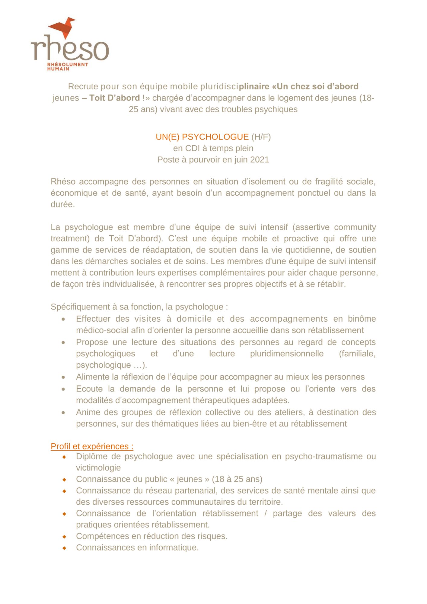 Rhéso recrute également pour son équipe mobile pluridisciplinaire « Un chez soi d’abord jeunes – Toit D’abord ! » chargée d’accompagner dans le logement des jeunes (18-25 ans) vivant avec des troubles psychiques :