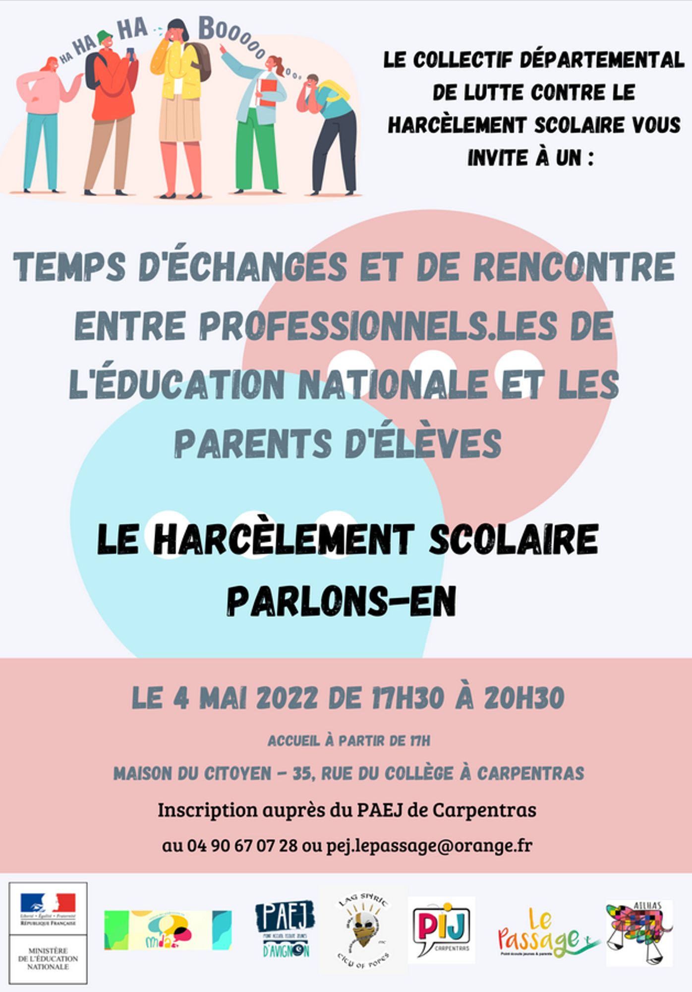 Le Point Information Jeunesse (PIJ) de Carpentras et le Point Accueil Écoute Jeunes "le Passage" organise une rencontre afin de favoriser les échanges et la discussion sur la question du harcèlement scolaire, où sont invités des professionnels de l'Education nationale et des parents. L’objectif est de faire le point sur les actions existantes de lutte contre le harcèlement scolaire, de mettre en évidence les limites et les manques de celles-ci et enfin, de construire, ensemble, des propositions d’actions. Cette rencontre aura lieu le :
