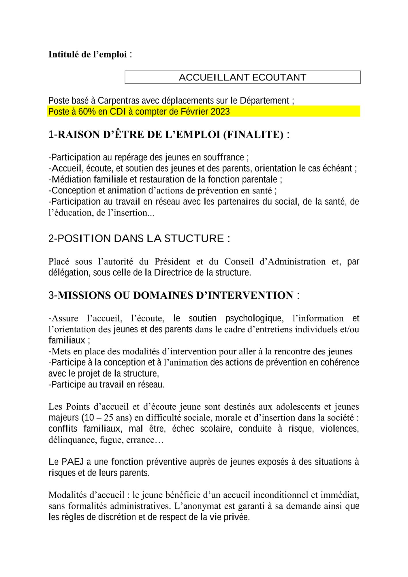 Le / la psychologue assure l’accueil, l’écoute, le soutien psychologique, l’information et l’orientation des jeunes et des parents dans le cadre d’entretiens individuels et/ou familiaux, met en place des modalités d’intervention pour aller à la rencontre des jeunes, participe à la conception et à l’animation des actions de prévention en cohérence avec le projet de la structure et au travail en réseau.