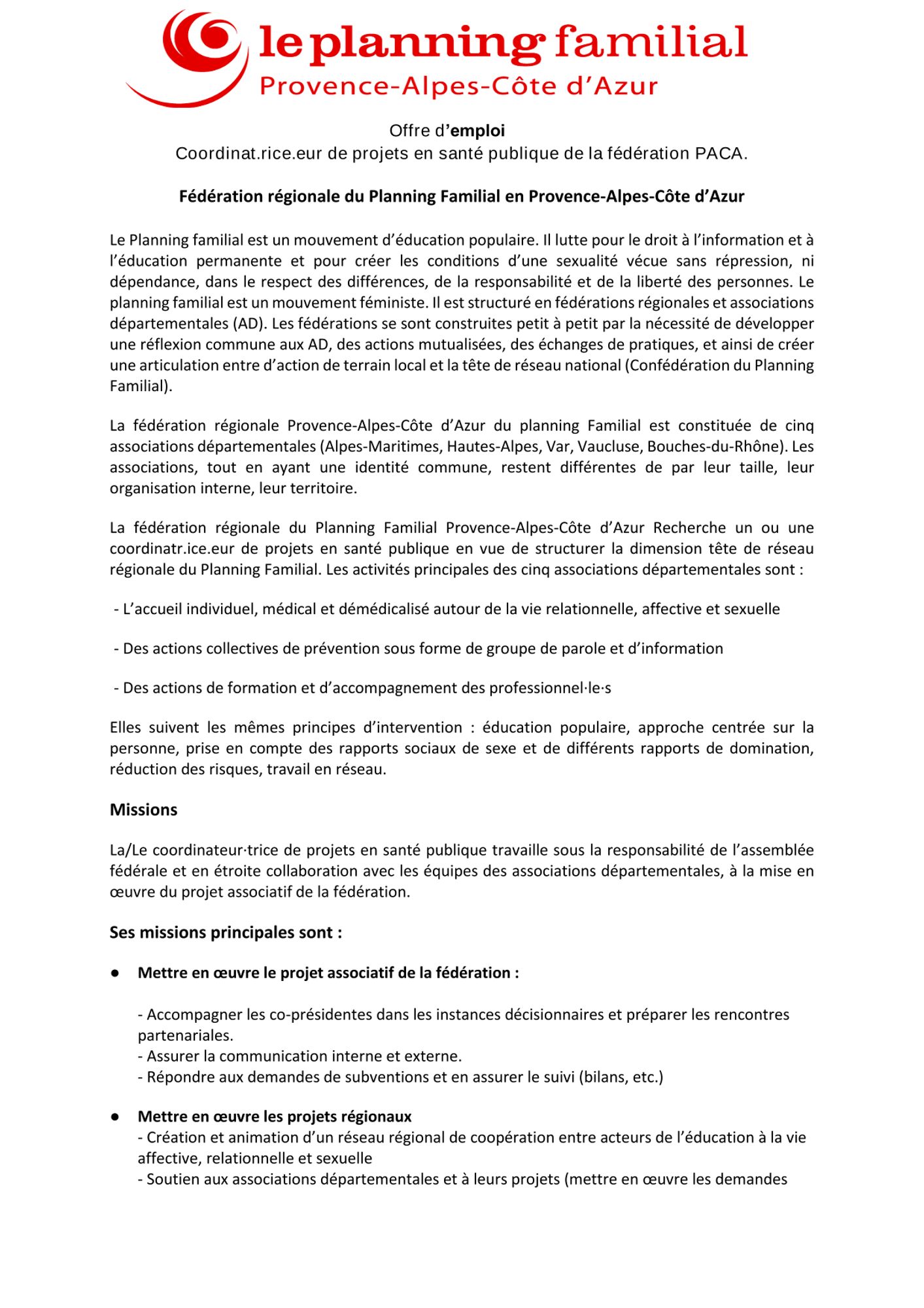 Le Planning Familial PACA recherche un.e coordinat.rice.eur de projets en santé publique de la fédération PACA afin de mettre en oeuvre le projet associatif de la fédération.