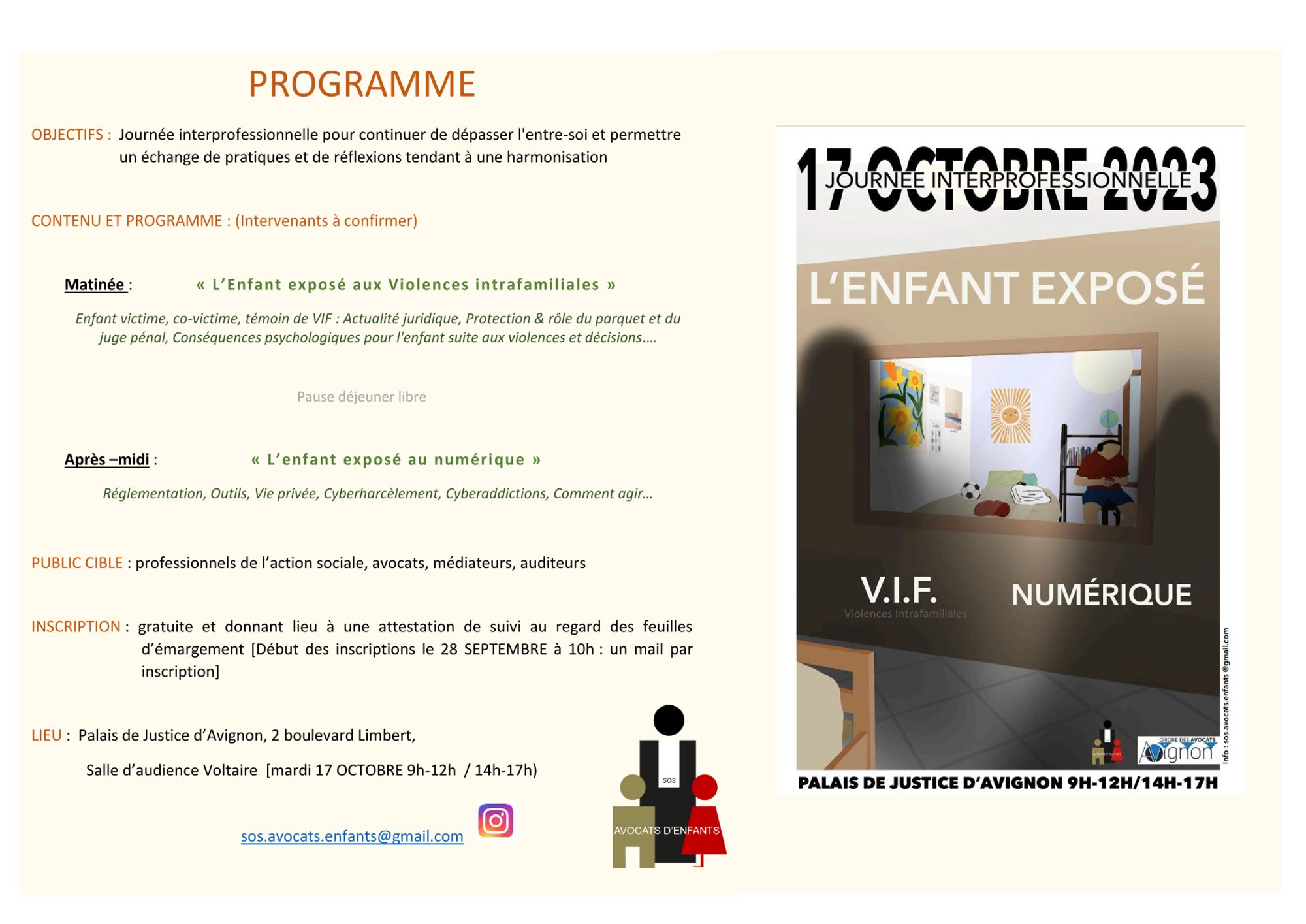 L'association SOS Avocats d'enfants organise cette journée interprofessionnelle avec pour objectif annoncé de "continuer de dépasser l'entre-soi et permettre un échange de pratiques et de réflexions tendant à une harmonisation" entre les professionnels de la justice et de l'action sociale. Cette journée aura lieu le :
