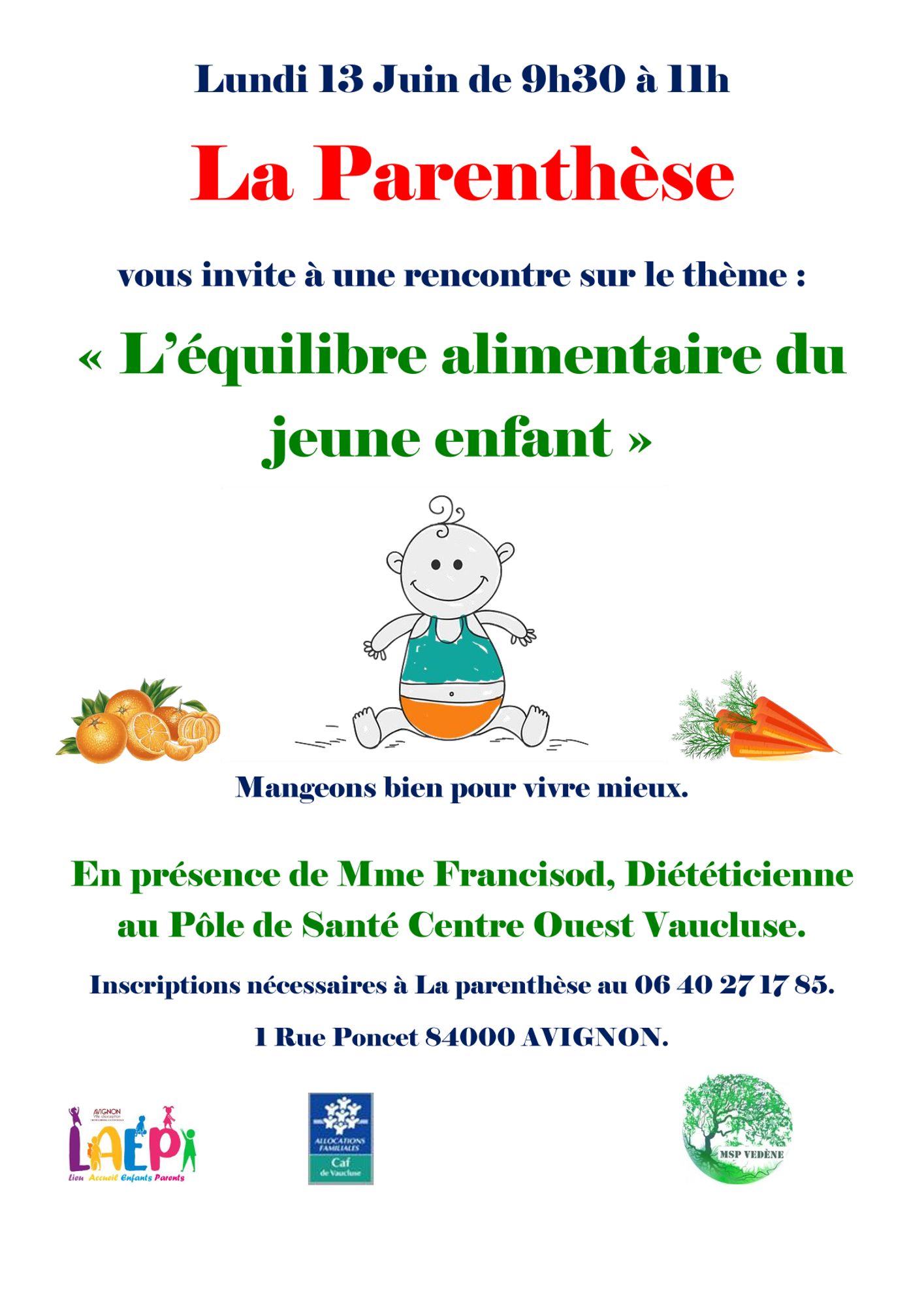 Organisée par le Lieux d’accueil enfant parent – LAEP La Parenthèse à Avignon, La rencontre sur le thème "L'équilibre alimentaire du jeune enfant" sera animé par de Mme Francisod, Diététicienne au Pôle de Santé Centre Ouest Vaucluse.