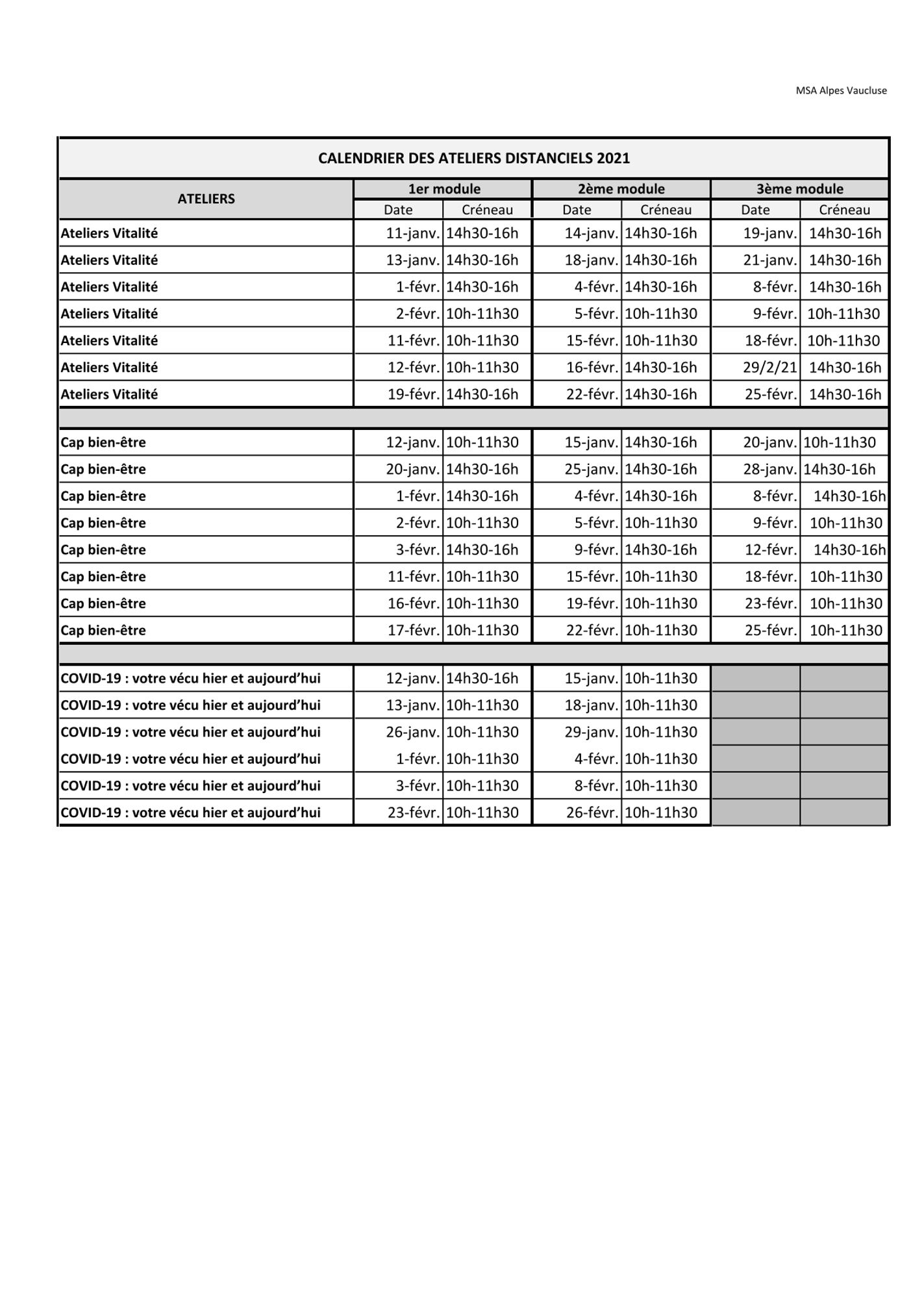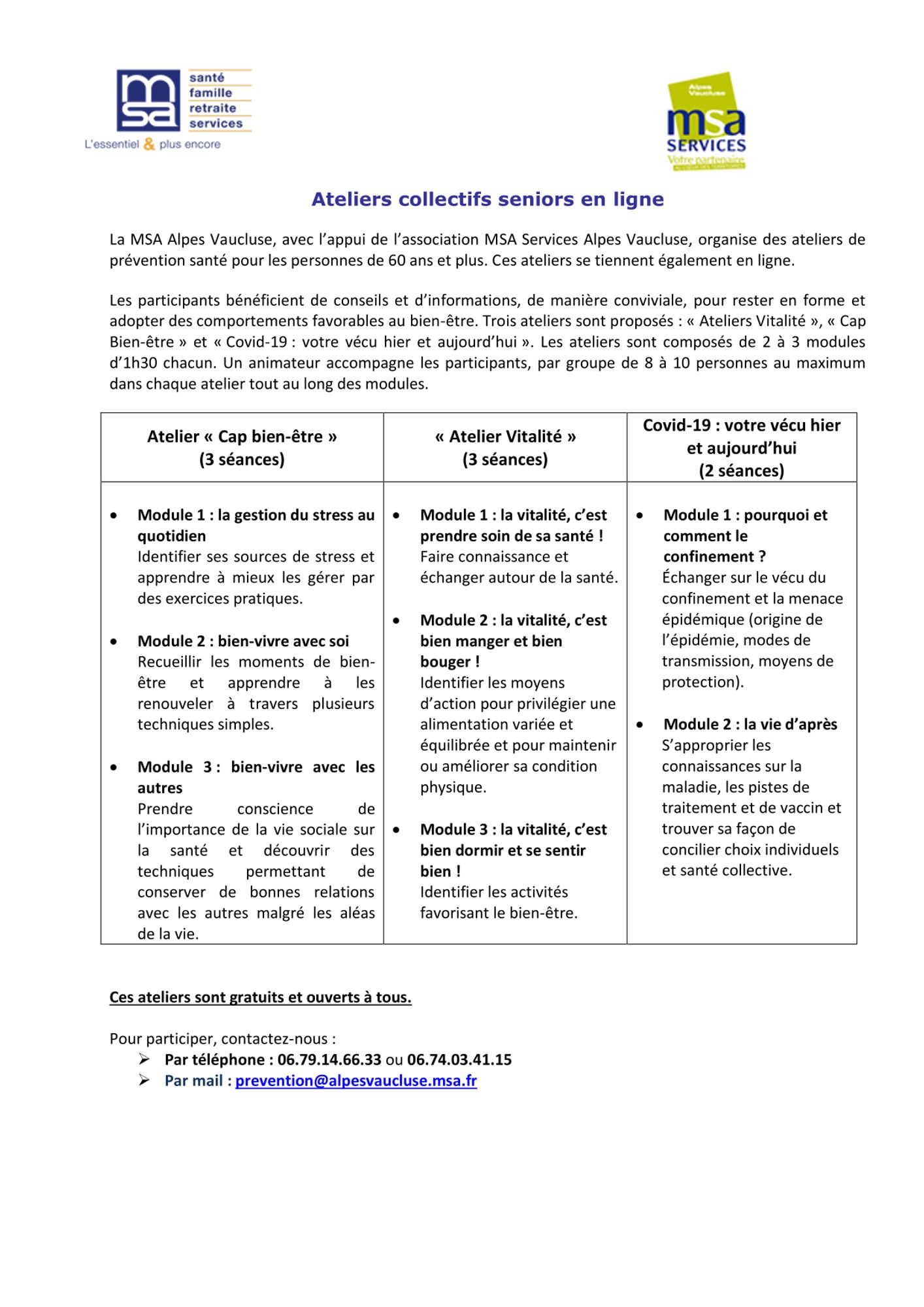La MSA Alpes Vaucluse propose des ateliers de prévention seniors en distanciel pour les mois de janvier et février 2021. Les ateliers proposés sont les suivants :