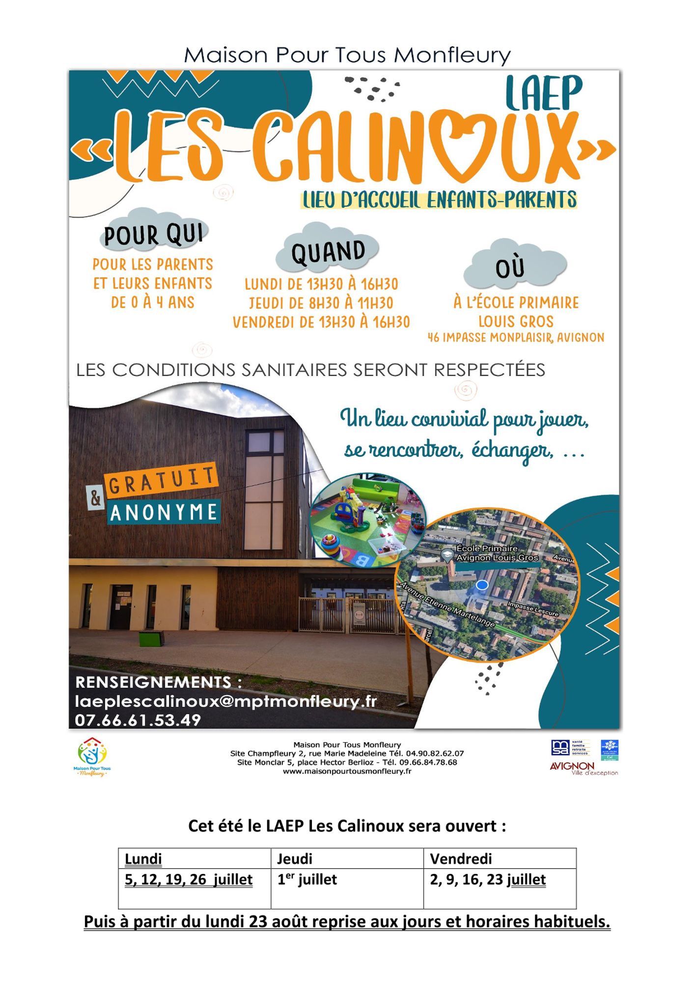 Le LAEP les Calinoux / Maison pour tous de Champfleury basé sur l’école primaire Louis Gros sera ouvert tout le mois de juillet seulement les lundis et vendredis après-midi et à nouveau à partir du 23 aout aux horaires habituels : lundi et vendredi de 13h30 à 16h30 et jeudi de 8h30 à 11h30.