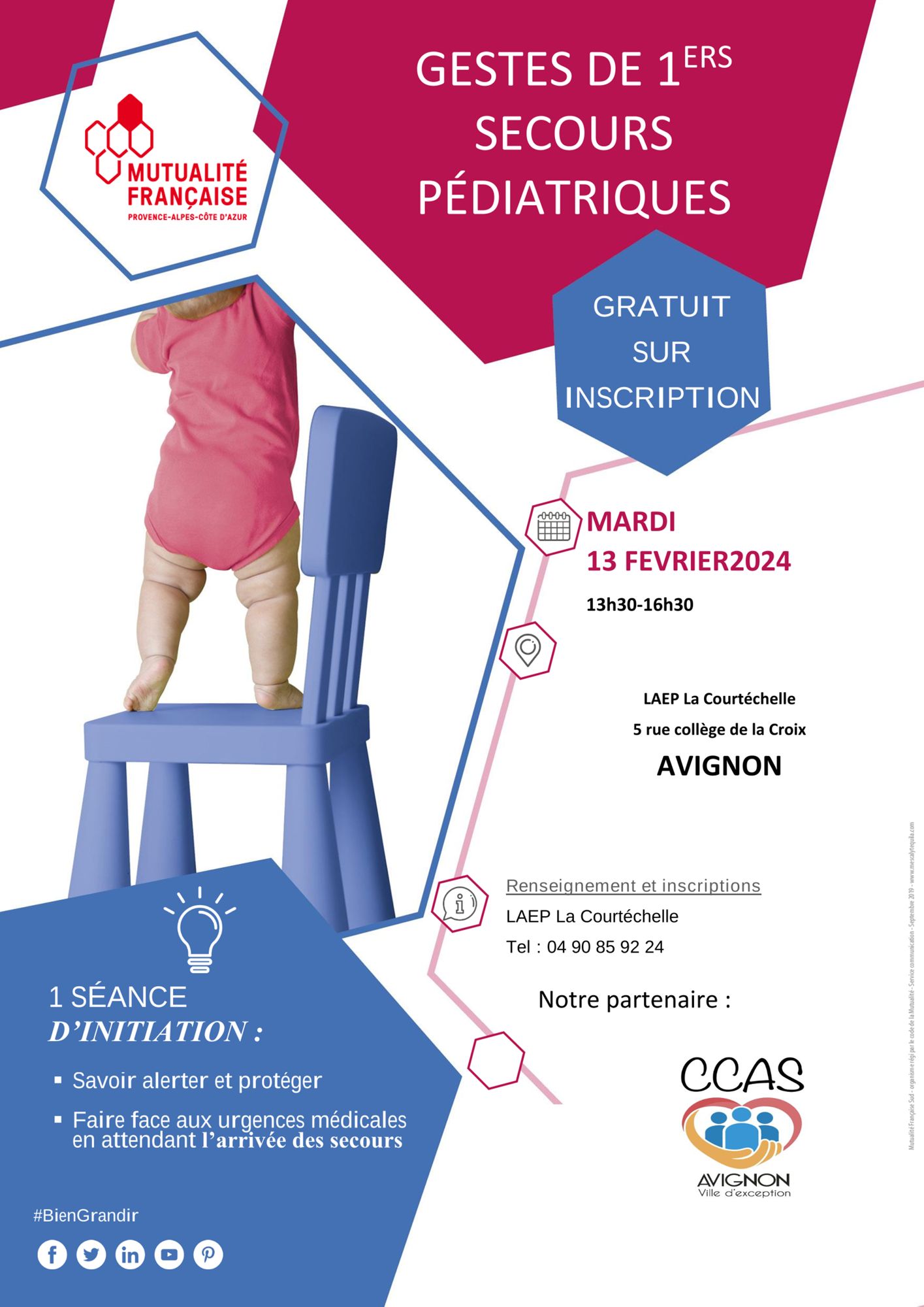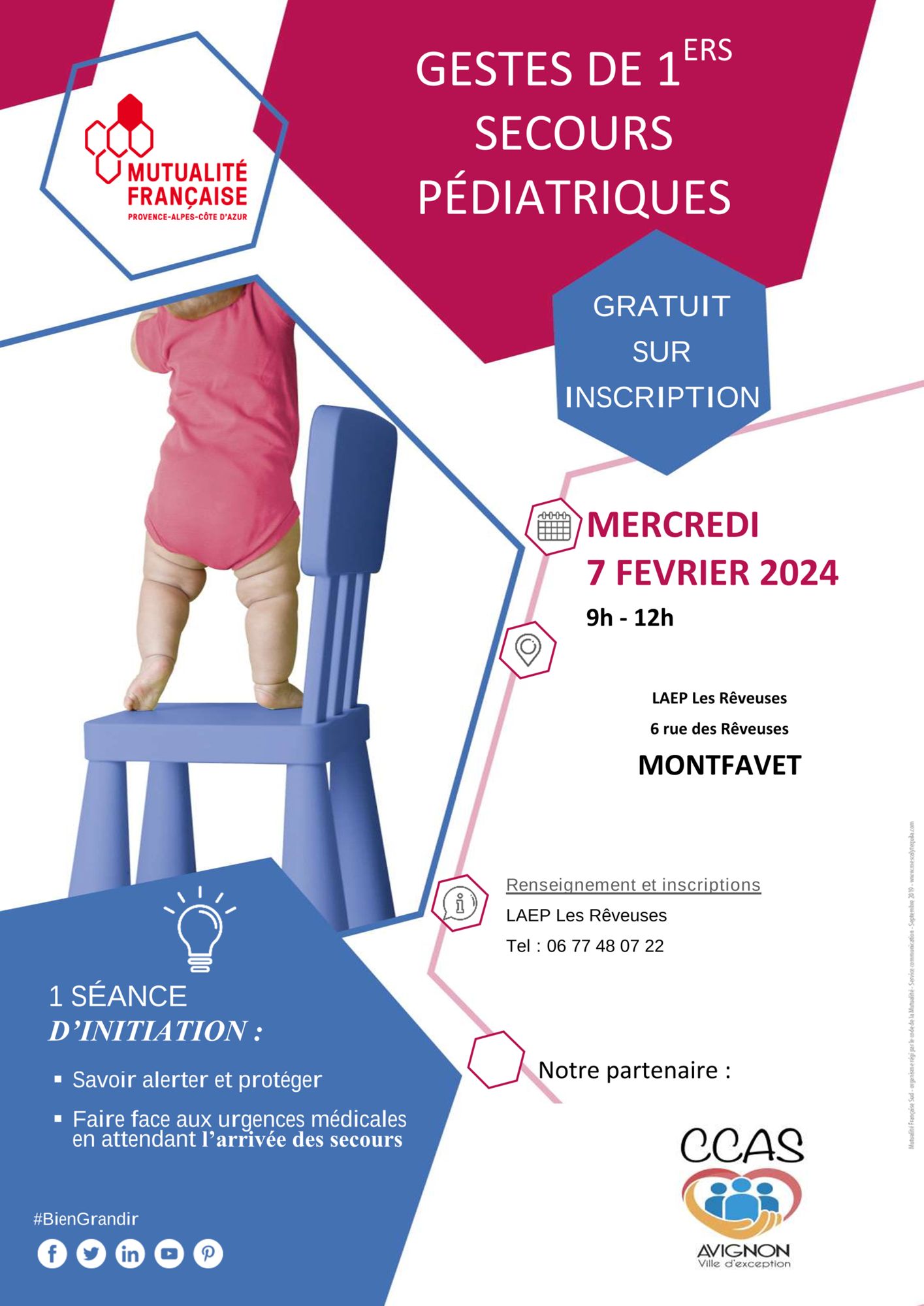 - Gestes de 1ers secours pédiatriques les 7 et 13 février, le 12 mars