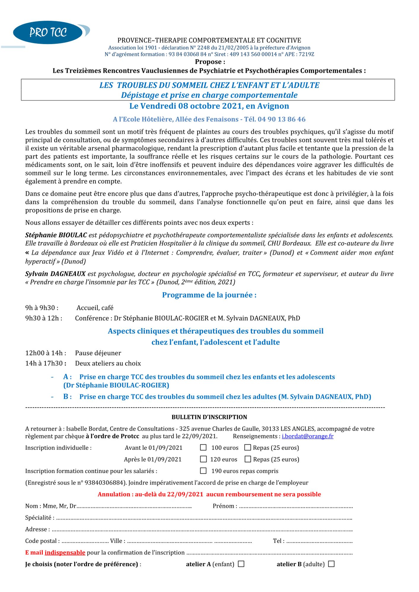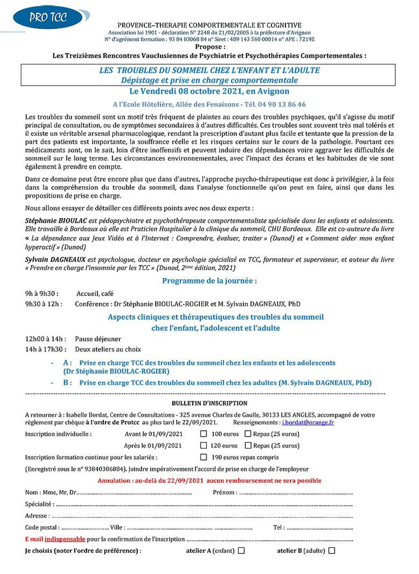 L'association PRO-TCC (Provence Thérapies comportementales et cognitives) organisent ces "Treizièmes Rencontres Vauclusiennes de Psychiatrie et Psychothérapies Comportementales" pour détailler ce que l'approche psycho-thérapeutique peut apporter dans la compréhension, l'analyse fonctionnelle et les propositions de prise en charge des troubles du sommeil.