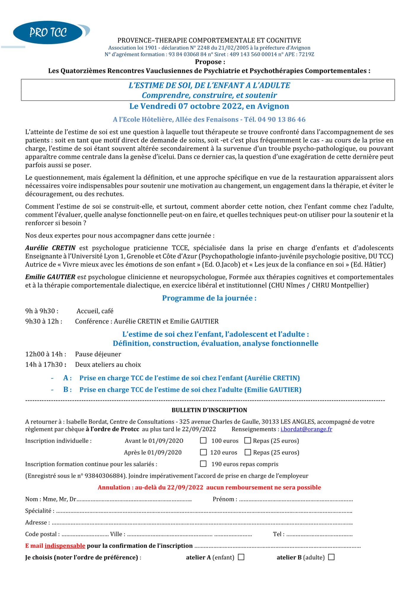 Organisées par l'association Provence - Thérapie comportementale et cognitive (PRO TCC), ces 14èmes rencontresaccueilleront deux expertes : Aurélie CRETIN, psychologue praticienne TCCE, spécialisée dans la prise en charge d’enfants et d’adolescents et Emilie GAUTIER, psychologue clinicienne et neuropsychologue. Elles aborderont les définition, construction, évaluation et analyse fonctionnelle de l'estime de soi chez l’enfant, l’adolescent et l’adulte ainsi que les prises en charge TCC associées. Cette journée se déroulera le :