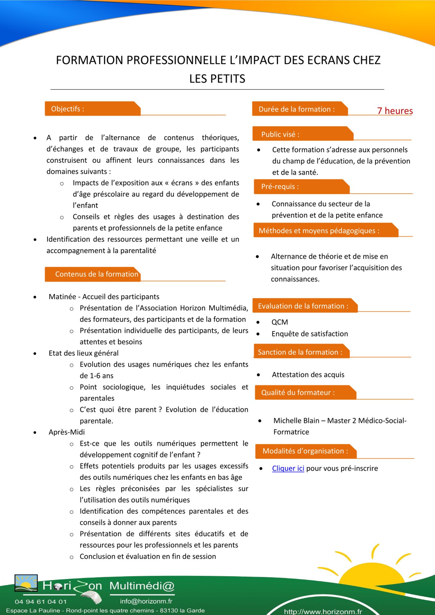 L'association Horizon Multimédia mène des actions de formation et d’animation Multimédia en direction de tous types de publics, sur la région PACA. Celle-ci vous propose une formation à destination des professionnels de la petite enfance qui s'intitule "L'impact des écrans chez les petits". Cette formation aura lieu :