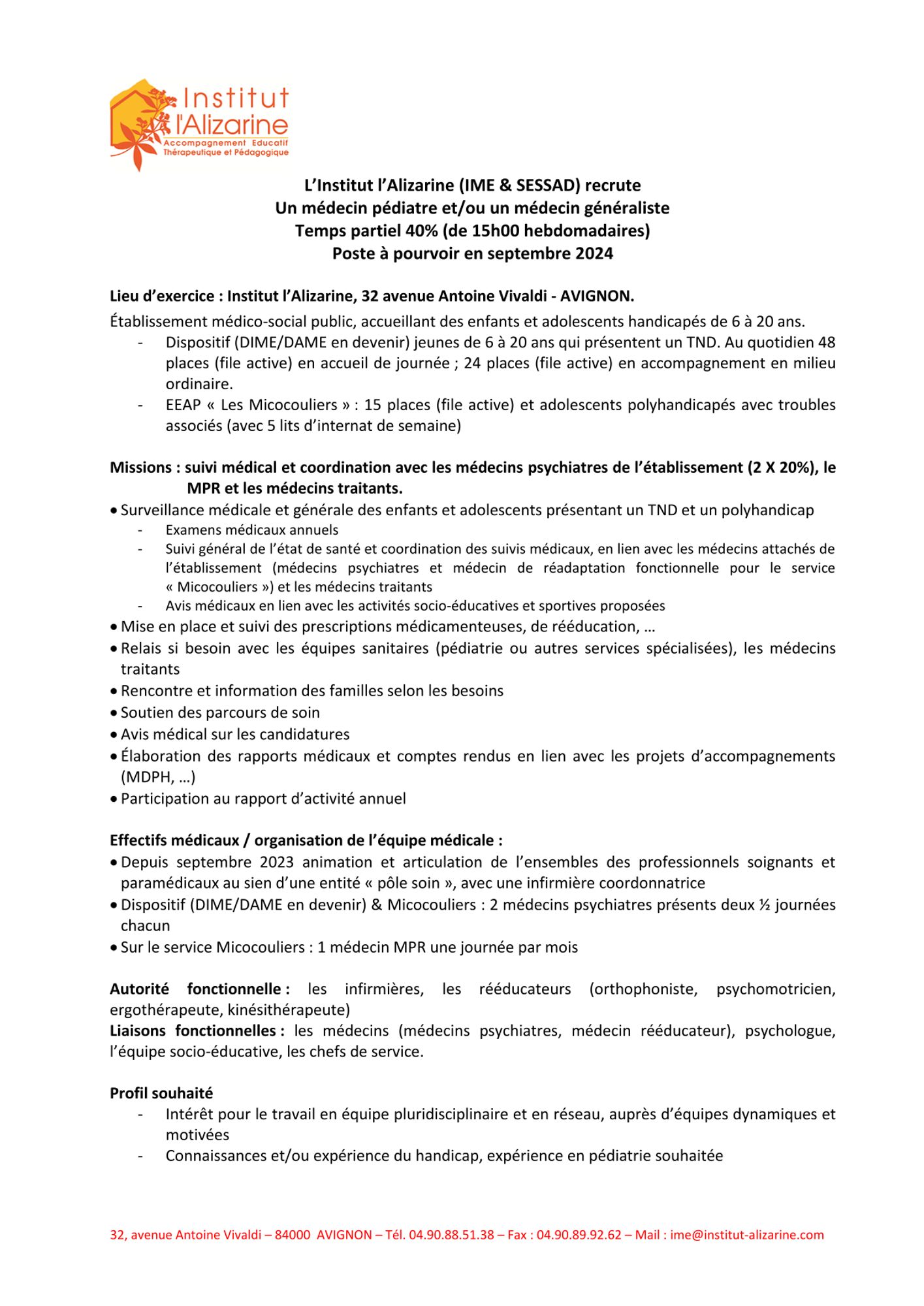 L’Institut l’Alizarine (IME & SESSAD) recrute un médecin pédiatre et/ou un médecin généraliste (H/F)