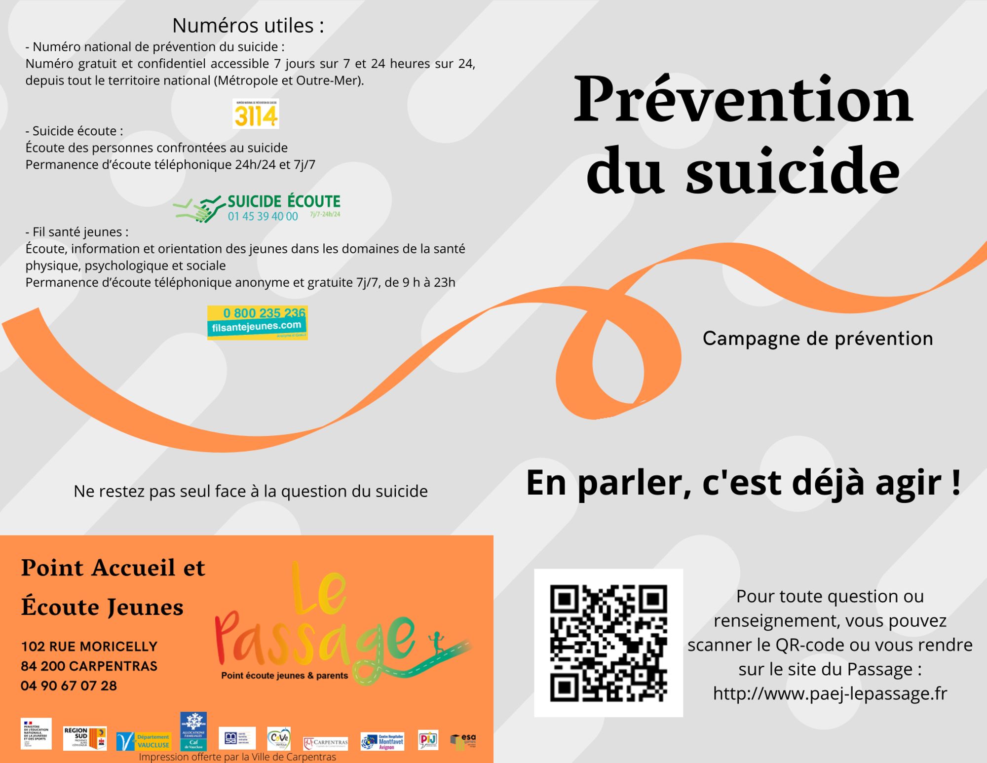 Cette campagne de prévention du suicide vient d'être lancée par le Point Ecoute Jeunes et Parents "Le Passage" à Carpentras, afin de mobiliser les jeunes, les parents mais aussi les professionnels sur la thématique.
